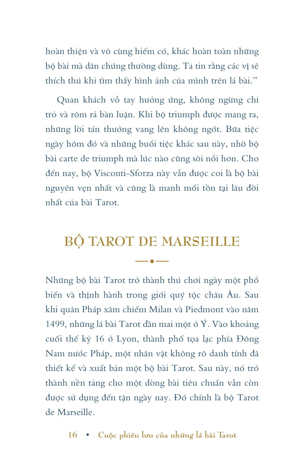Cuộc phiêu lưu của những lá bài Tarot là một cuộc hành trình xuyên qua thời gian và không gian, đưa bạn đi qua các giai đoạn lịch sử, khám phá nguồn gốc của Tarot, khám phá ý nghĩa biểu tượng và hình ảnh trên từng lá bài, cách mà chúng liên kết với nhau để tạo nên một hệ thống biểu tượng phức tạp và sâu sắc. Không chỉ đơn thuần “học về Tarot”, cuốn sáchcòngiúp bạn khám phá sự kết nối của Tarot với các lĩnh vực khác như tâm lý học, chiêm tinh học, thuật giả kim,… Bạn sẽ thấy sự hiện diện của Tarot ở khắp mọi nơi, trong mọi khía cạnh của trí tuệ nhân loại.
