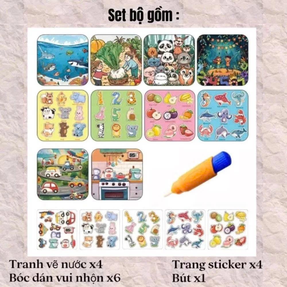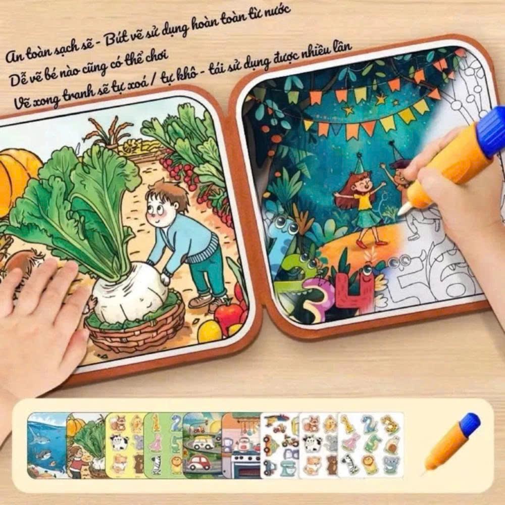Cuốn sổ ma thuật bóc dán vẽ tranh bằng nước thông minh cho bé phát triển tư duy trí não Chức năng vẽ tranh nước: Bộ sản phẩm đi kèm 4 trang tranh vẽ nước đặc biệt, giúp bé thỏa s...