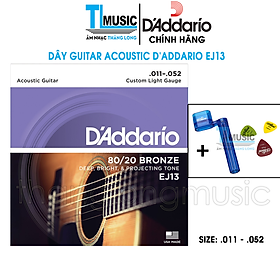 Dây đàn guitar Acoustic D’addario EJ13 là dòng sản phẩm dây Phosphor-Bronze (phosphor pha đồng) của hãng D’Addario (Mỹ), kích cỡ 11-52. Đây là mẫu dây guitar acoustic rất nổi tiếng, được người dùng đánh giá cao và được coi là một trong những bộ dây tốt nhất dành cho dòng guitar acoustic.
