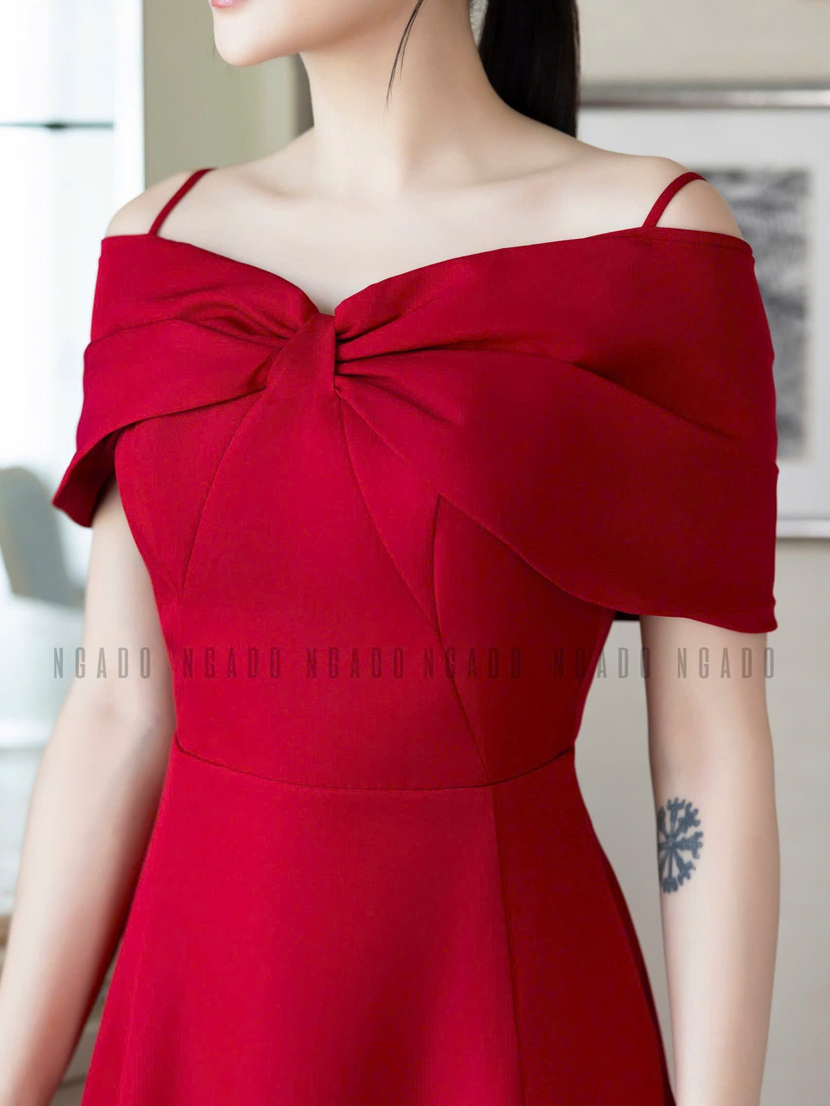 ✨Đầm đỏ bẹt vai NGADO , đầm xòe dáng dài , đầm dự tiệc