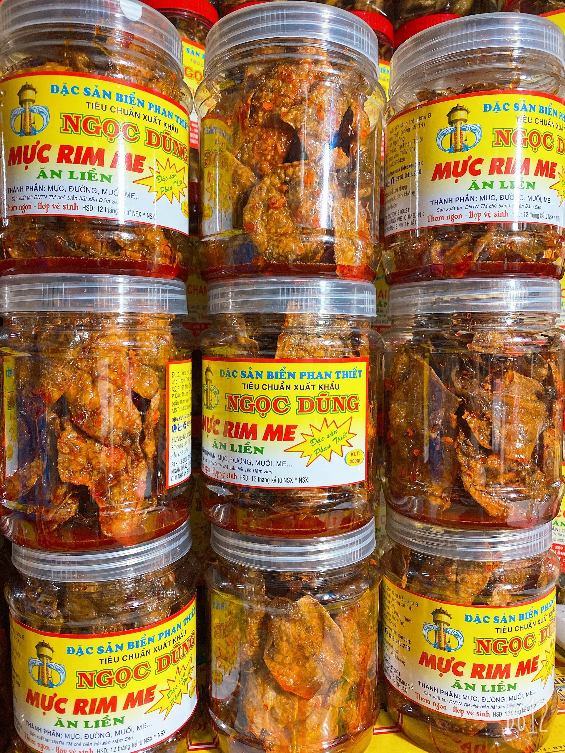 Mực rim me ( ăn liền ) hộp 250 gram được chế biến từ mực ống hay mực lá còn tươi xanh tại Cảng cá Phan Thiết tỉnh Bình Thuận là món ăn ngon của