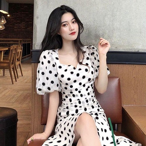 Váy cổ vuông tay phồng cột dây