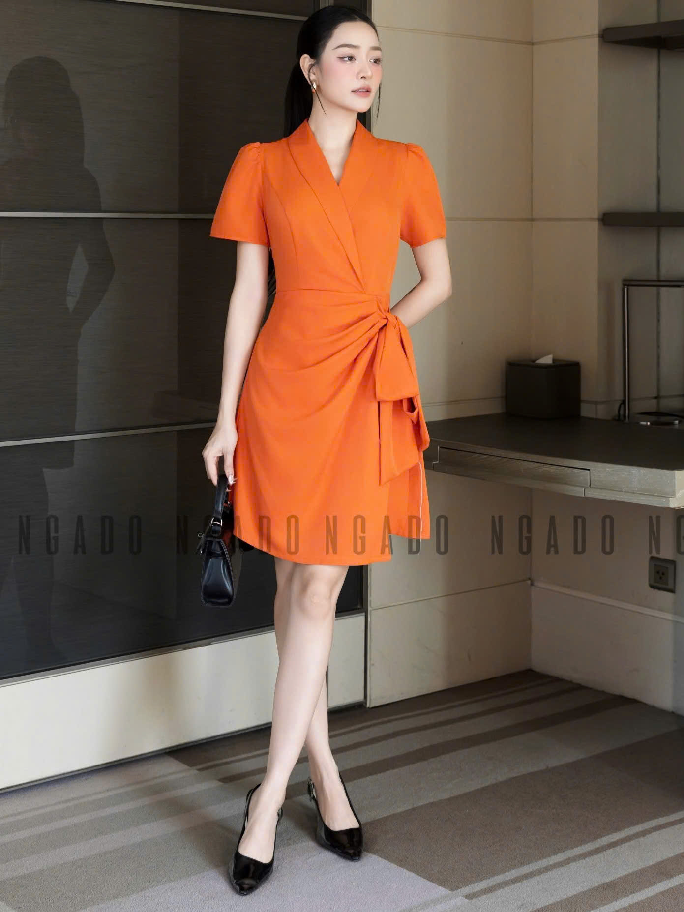 ✨Đầm cam vạt xếp NGADO , đầm ngắn , đầm thiết kế Nữ