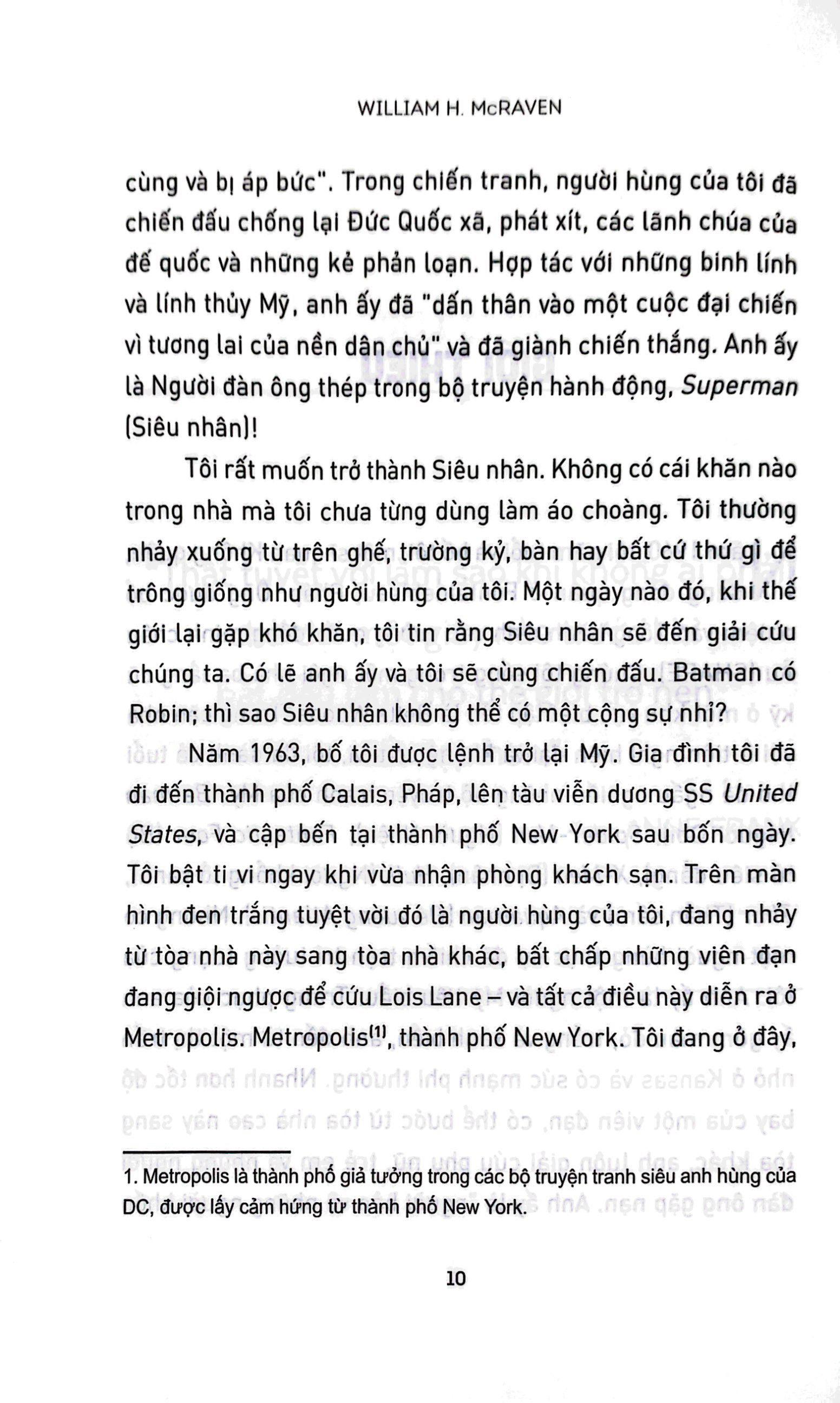 Khi còn là một cậu bé, đô đốc McRaven mơ ước trở thành một siêu nhân, khao khát sử dụng siêu năng lực để cứu thế giới. Lớn lên rồi ông nhận ra không có siêu nhân ngoài đời thực như trong tưởng tượng của ông: có bộ giáo siêu nhân và siêu năng lực.