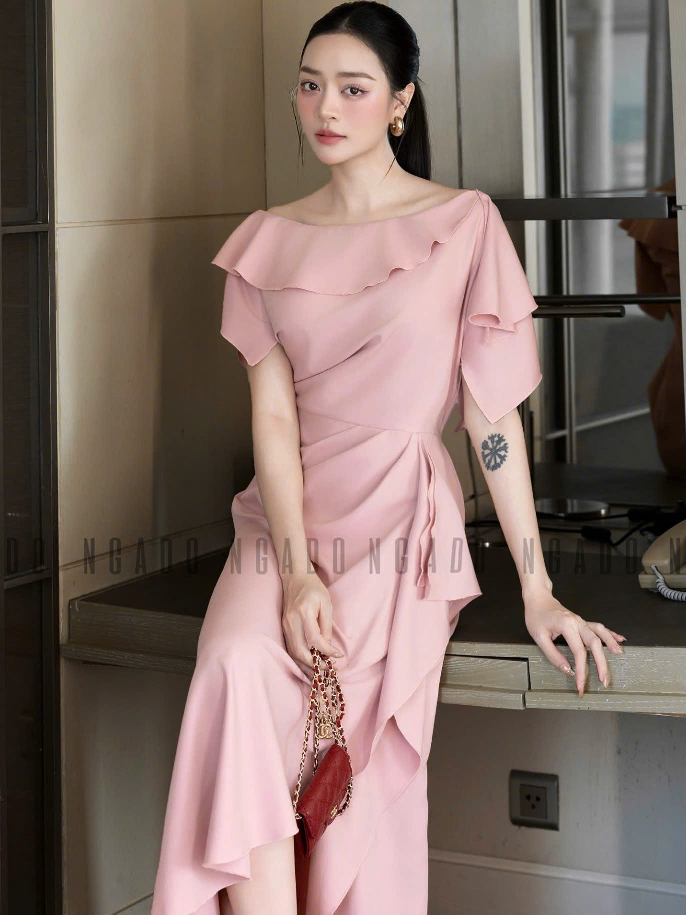 ✨Đầm hồng cổ thuyền vạt xéo NGADO , đầm dài , đầm dự tiệc , sang trọng