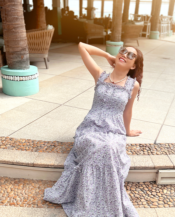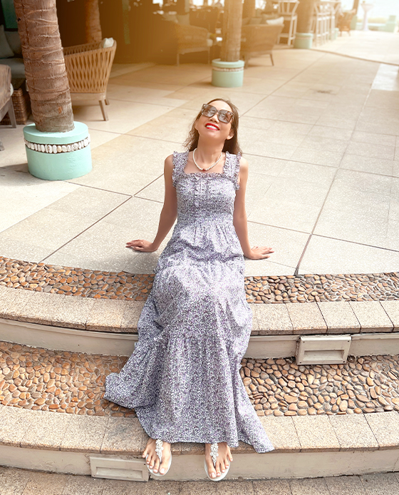 Đầm Maxi Hoa Violet DRE161 Thời trang thết kế HityDáng đầm maxi dài đến mắc cá chânNgực ngang ôm trọn vòng ngực, eo ômHai dây bảng to phía trước, thu nhỏ về sau tạo nét mềm mại uyển chuyển cho bờ ...