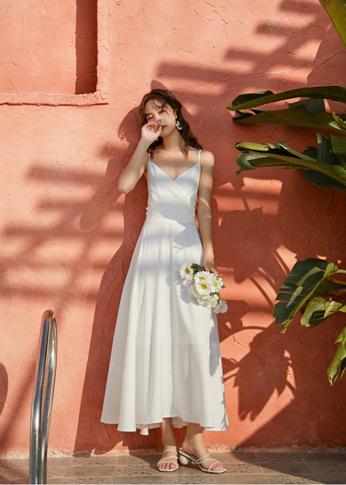 - Dạo bước trên bãi biển với chiếc váy lụa trơn, suông, trần lưng với điểm nhấn là chiếc nơ cực kì điệu đà.