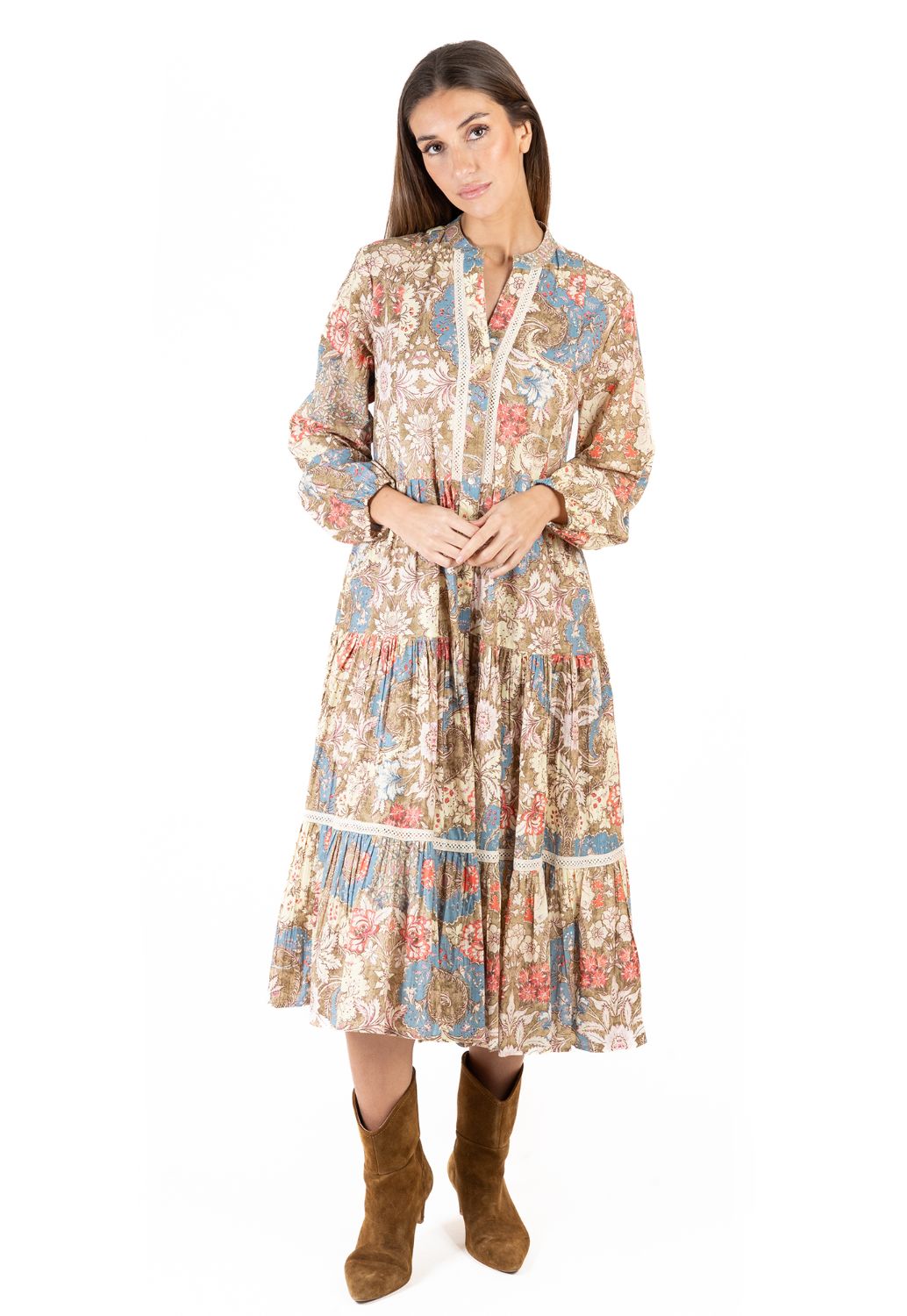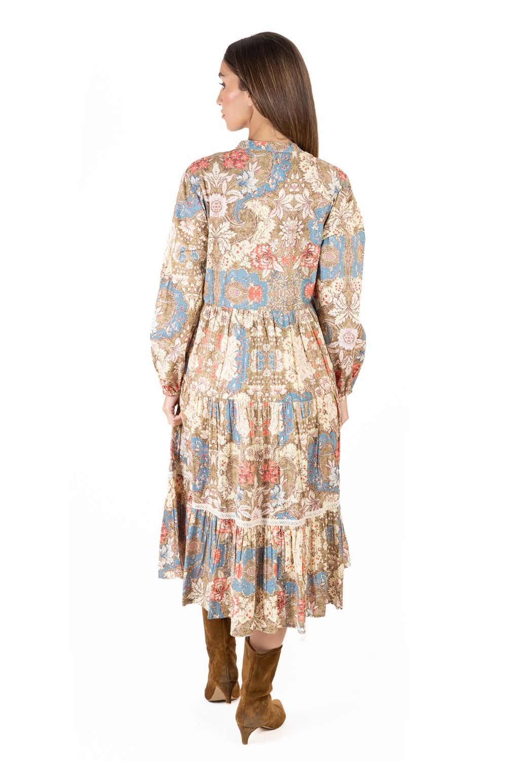 Maxi Boho Dài Tay Kết Cườm Cotton Isla Bonita, chất liệu cotton cao cấp, mềm mại, nổi bật phần ngực trước kết cườm sang trọng. Họa tiết thổ cẩm độc đáo. Phom suông. Dài Đầm