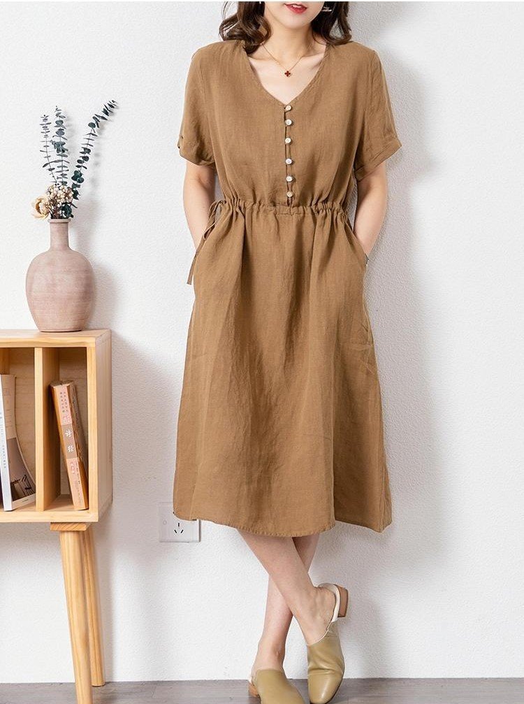 ✨Đầm nữ cổ V phong cách Hàn Quốc thanh lịch, chất linen mát, dầm có túi siêu xinh NH173 nâu