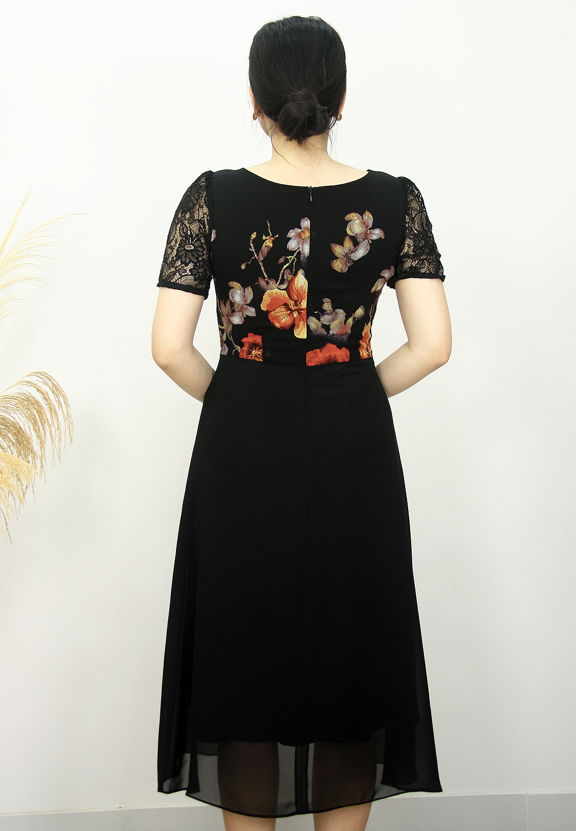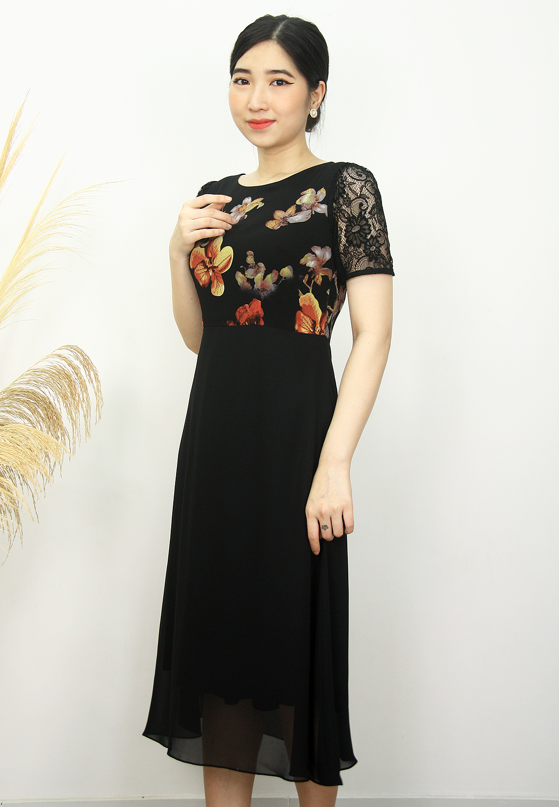 Thiết kế đầm dáng xòe A thoải mái, mang lại cho người mặc sự thanh lịch, dịu dàng. Họa tiết hoa nhẹ nhàng, dễ phối với nhiều loại phụ kiện. Cổ tròn đơn giản, tay lỡ phối ren sang trọng.