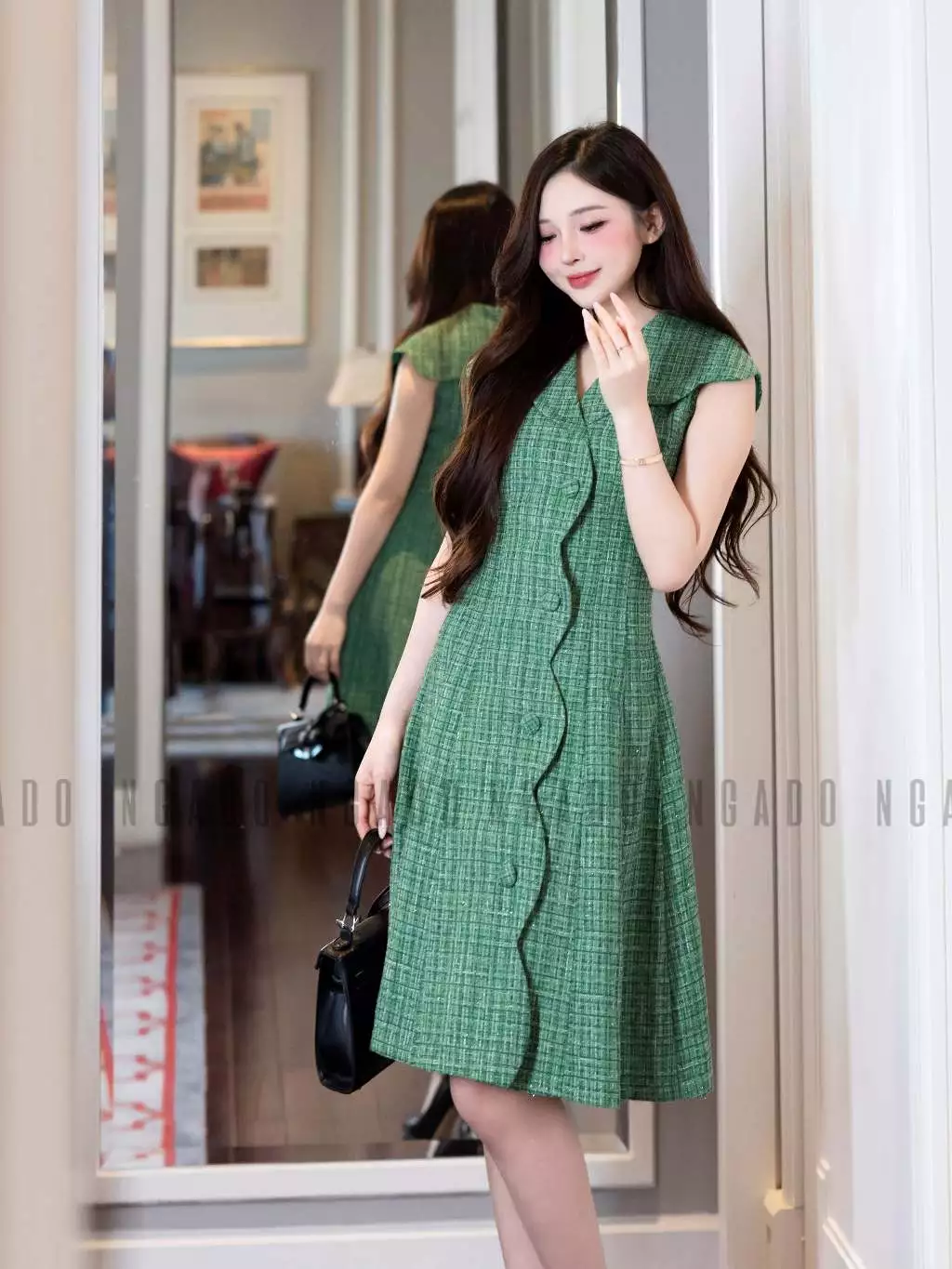 ✨Đầm tweed xanh cổ vest NGADO , đầm ngắn dự tiệc