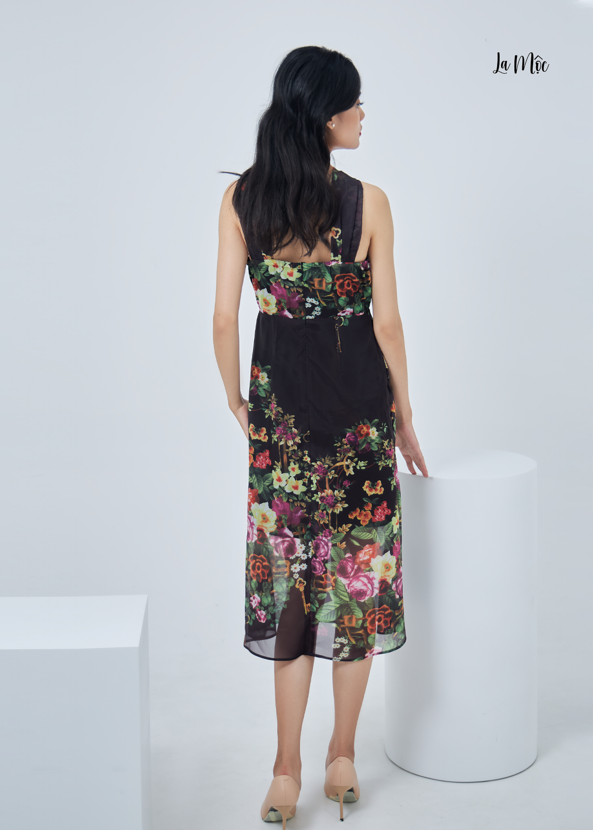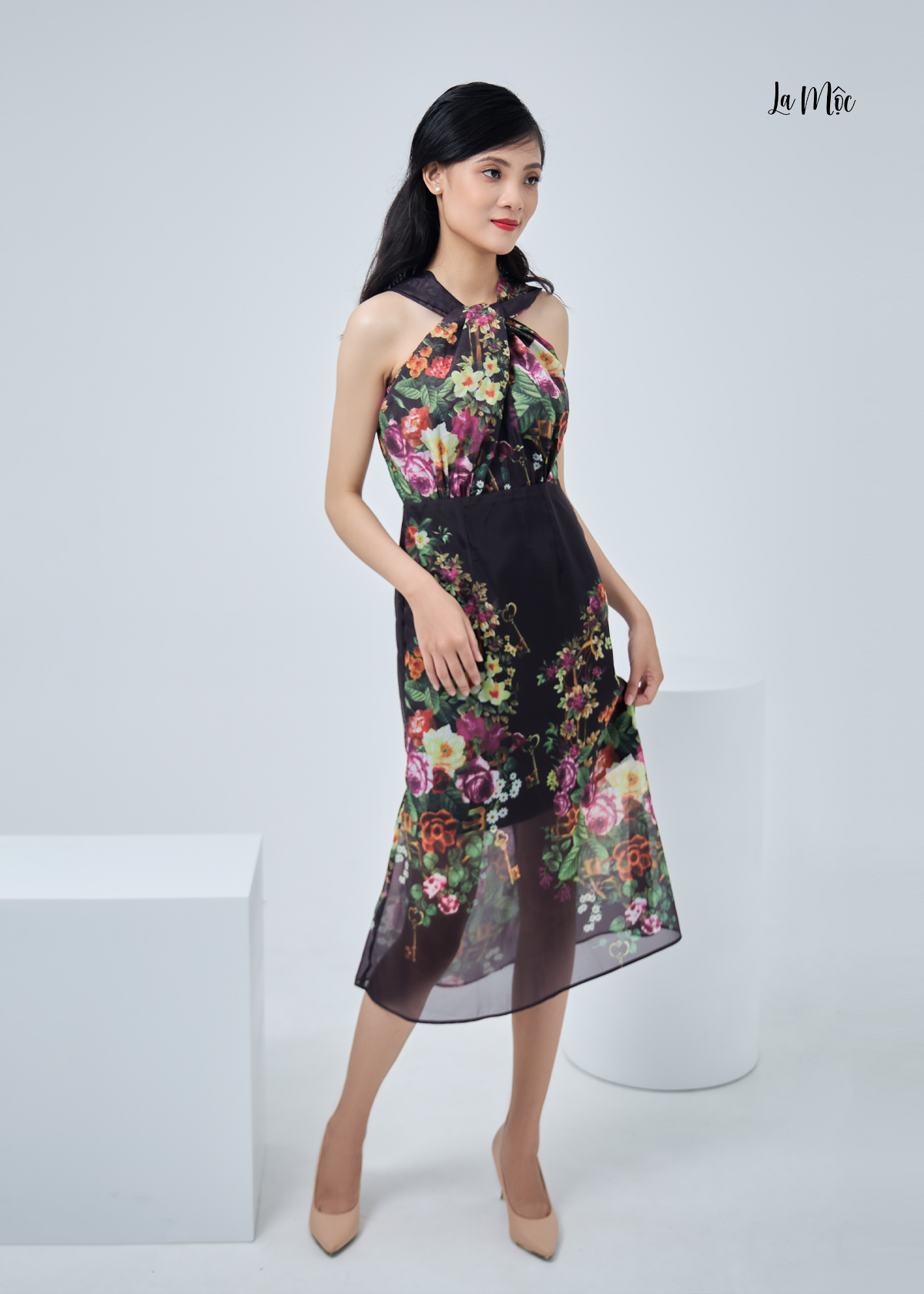 Đầm voan cổ yếm La Mộc dáng ôm body, họa tiết hoa, xòe nhẹ phần chân váy, ôm phần eo khoét lưng. 1. Thông tin sản phẩm Mã sản phẩm: LM0122124 Chất liệu: CHIFFON HÀN