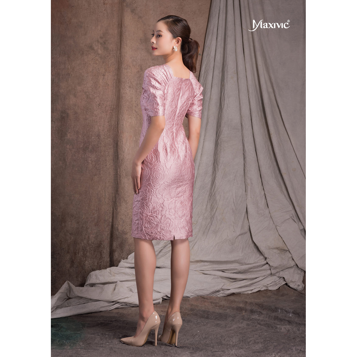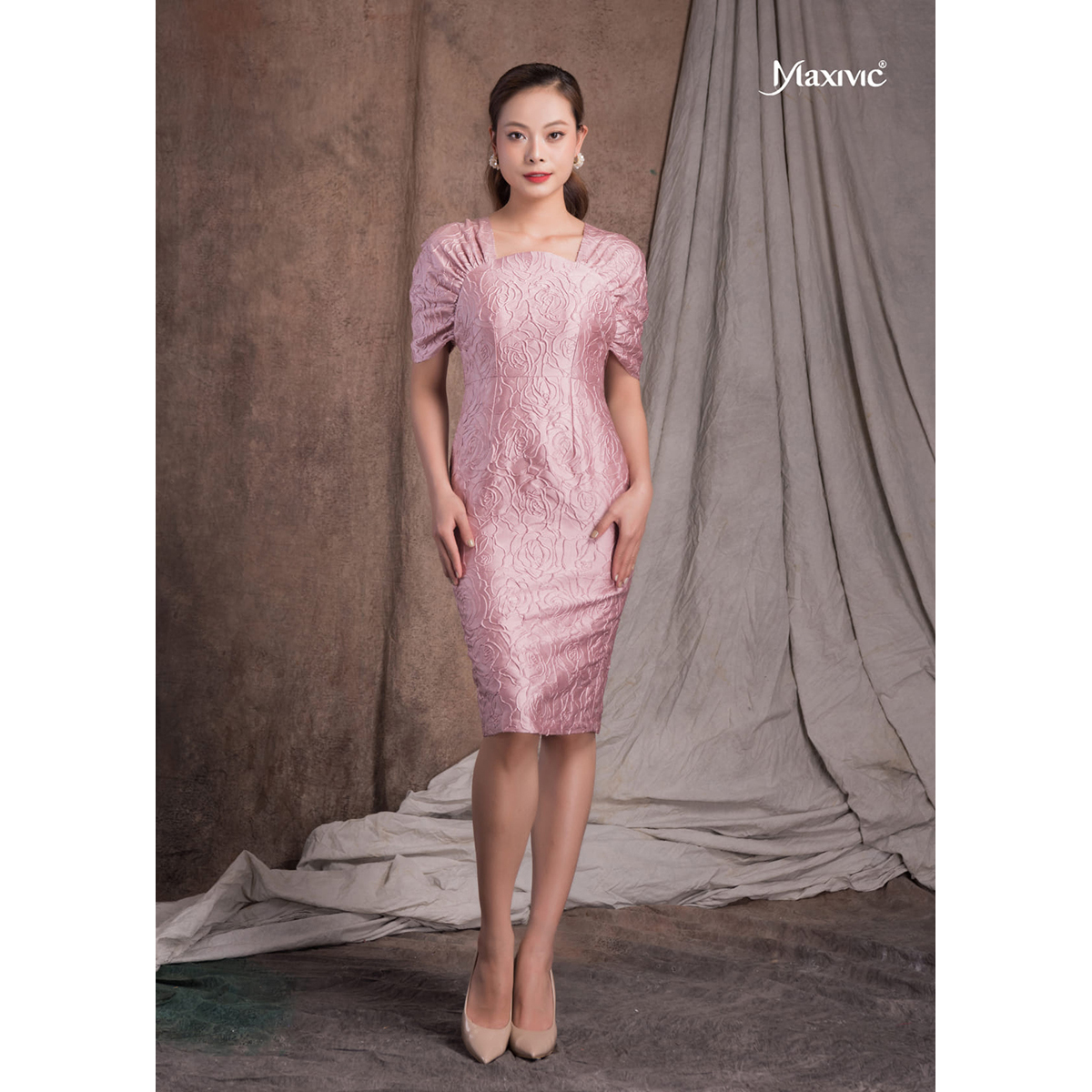 ✨Đầm Xogam Hồng Tay Liền Họa Tiết Nổi Maxivic M122212