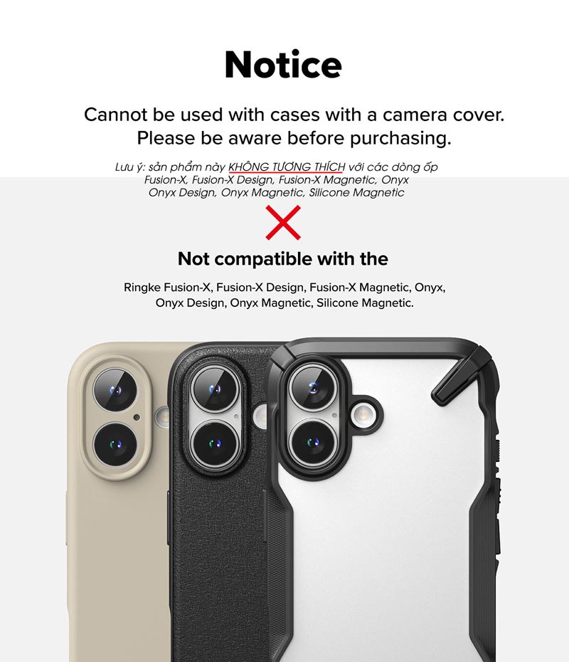 - KHÔNG tương thích với ốp lưng RINGKE: Fusion-X, Fusion-X Design, Fusion-X Magnetic, Onyx, Onyx Design, Onyx Magnetic, Silicone Magnetic