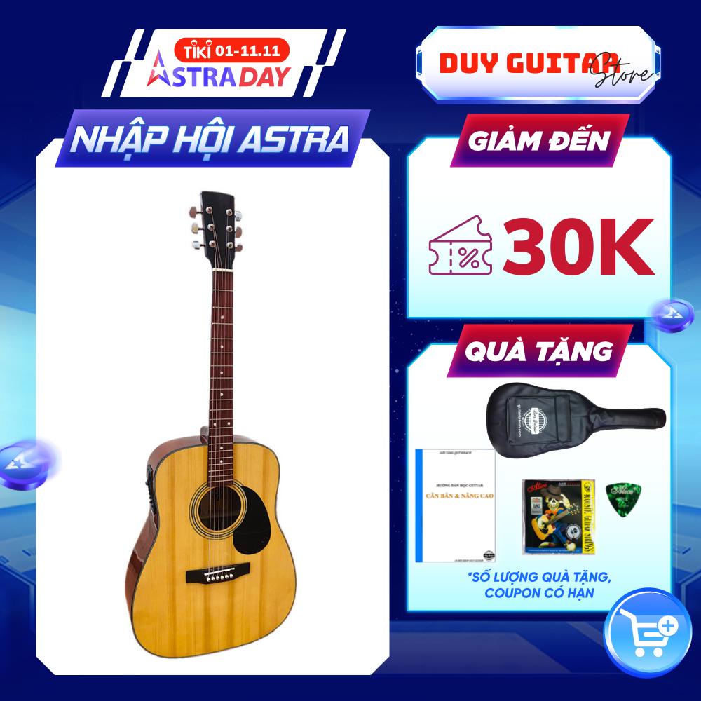 Mua tại TiktokThông tin chi tiết cây đàn acoustic DD120X có EQ 7545R Đàn Guitar acoustic Mã: DD120X Mặt: gỗ thông Eo + lưng: gỗ hồng đào Cần: gỗ thao lao Mặt phím: gõ mật Ngựa: gõ mật Dây: alice A206 Khóa: Taiwan EQ: 7545R