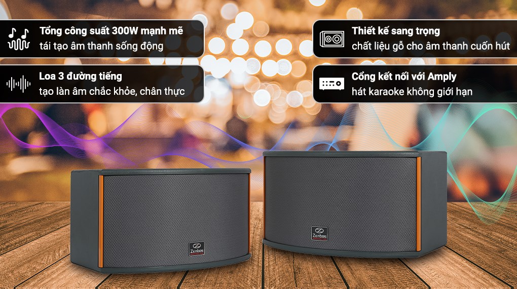 *Loa karaoke Zenbos CR-5 300W/Loa - Số đường tiếng của loa: 3 đường tiếng- Công suất: 300W/Loa- Cổng phát nhạc: kết nối với Amply- Kích thước: 48.5x28x27 cm - Nặng: 10kg- Bass: 20 cm Treble: