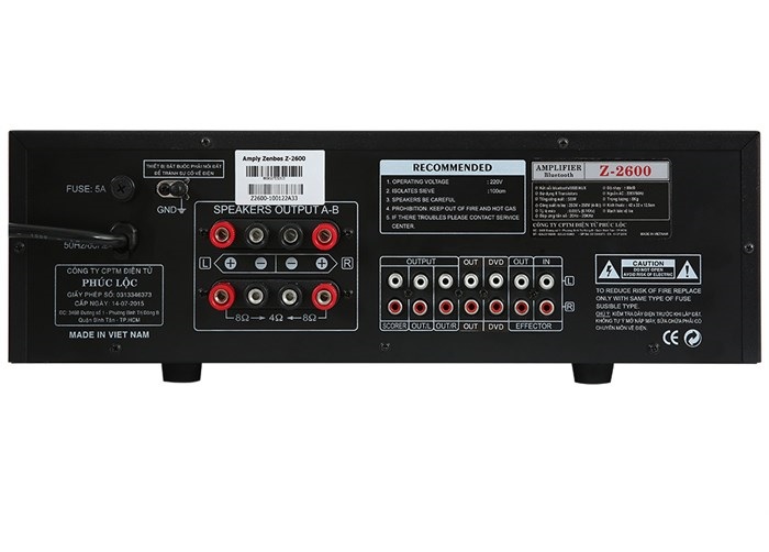 - Số lượng kênh: 2 kênh- Tổng công suất: 500W- Nguồn: 220V- Phím điều khiển: Nút bấm và nút vặn cơ học- Kết nối không dây: Bluetooth- Cổng phát nhạc: AV- Thẻ nhớ TF, Jack 3.5 mm, USB- Khoảng cách kết nối tối đa: 10m- Điều khiển bằng điện thoại: Có- Kích thước: 42x35x14 cm - Nặng: 8Kg- Sản xuất tại: Việt Nam- Hãng: Zenbos