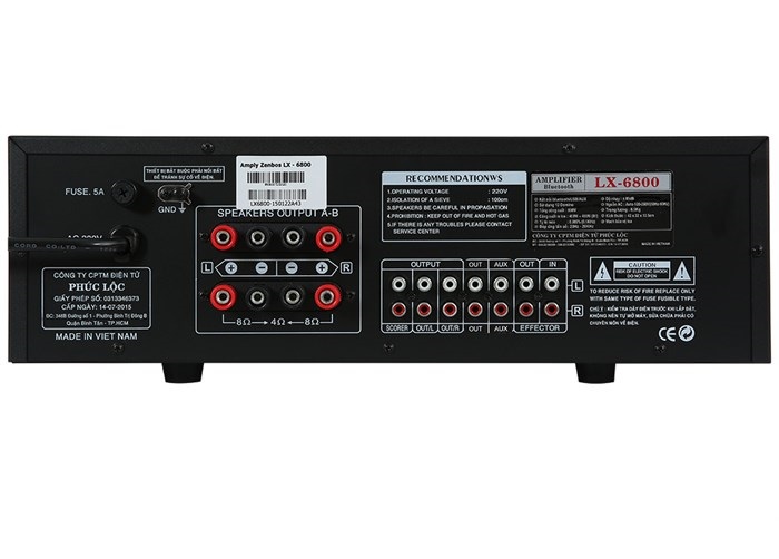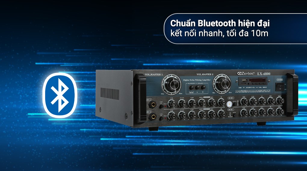 *Amply Zenbos LX-6800 800W- Số lượng kênh: 2 kênh- Tổng công suất: 800W- Nguồn: 220V- Phím điều khiển: Nút bấm và nút vặn cơ học- Kết nối không dây: Bluetooth- Cổng phát nhạc: AV- Thẻ nhớ TF, Jack 3.5 mm, USB- Khoảng cách kết nối tối đa: 10m- Điều khiển bằng điện thoại: Có- Kích thước: 42x25x14 cm - Nặng: 6.5 kg- Sản xuất tại: Việt Nam- Hãng: Zenbos