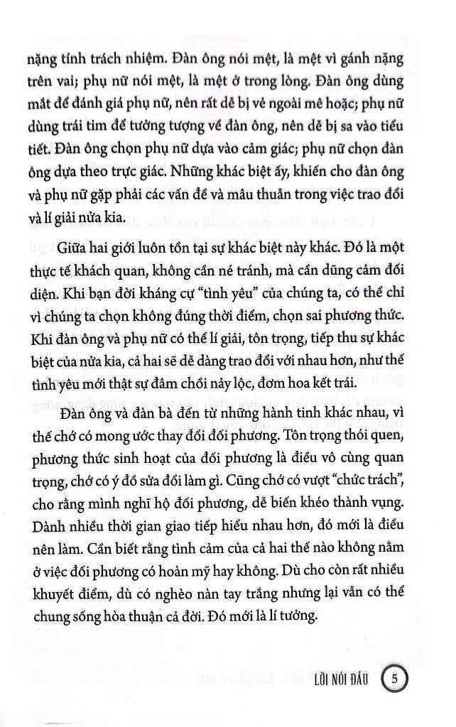 Hầu hết vấn đề xảy ra trong mối quan hệ giữa đàn ông và phụ nữ là kết quả của sự khác biệt tâm lý cơ bản giữa hai giới . Đối mặt với nó ra sao và giải quyết như thế nào luôn là mối quan tâm trăn trở của tất cả mọi người . Dù bạn đang yêu hay đã kết hôn , cuốn sách này sẽ đóng vai trò to lớn phân tích và đưa ra kỹ năng tôn trọng nhu cầu hay cảm nhận của đối phương , từ đó cải thiện mối quan hệ muôn thuở giữa "người sao Hoả " và " người sao Kim " .