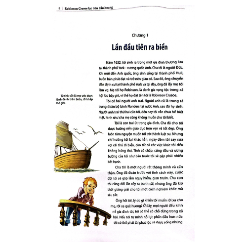Robinson Crusoe lạc trên hoang đảo là một trong những câu chuyện thuộc tủ sách văn học kinh điển Thế Giới. Tác giả Daniel Defoe đã dùng ngòi bút của chủ nghĩa hiện thực để kể về câu chuyện chàng thủy thủ Robinson bị đắm tàu, lưu lạc đến đảo hoang và trải qua một cuộc sống rất gian khổ trong sự cô đơn; nhưng bằng nghị lực và lòng quyết tâm của mình Robinson đã trở về được với quê hương của mình.