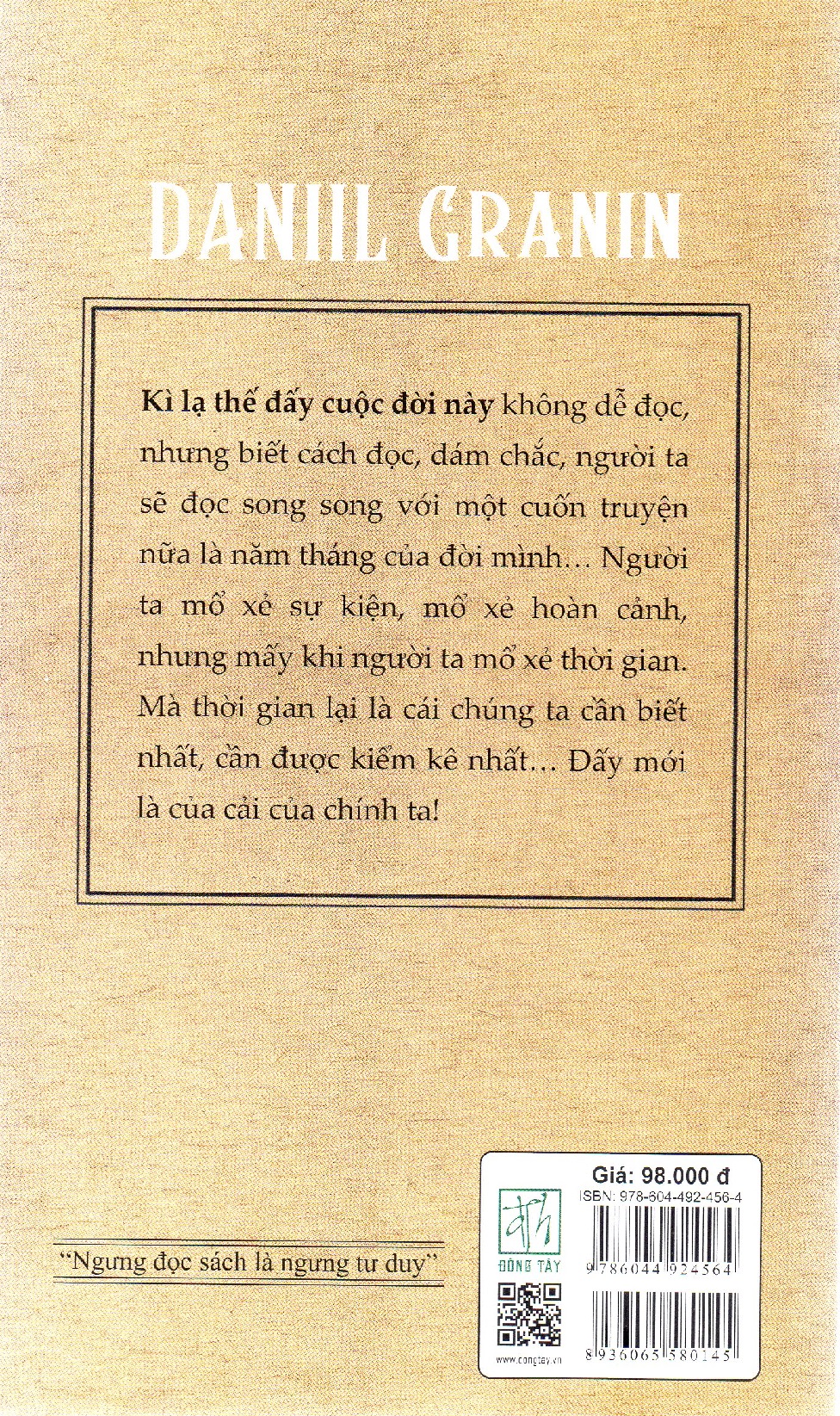 Kì lạ thế đấy cuộc đời này không dễ đọc, nhưng biết cách đọc, dám chắc, người ta sẽ đọc song song với một cuốn truyện nữa là năm tháng của cuộc đời mình...Người ta mổ xẻ sự kiện, mổ sẻ hoàn cảnh, nhưng mấy khi người ta mổ xẻ thời gian. Mà thời gian lại là cái chúng ta cần biết nhất, cần được kiểm kê nhất... Đấy mới là của cải của chính ta!
