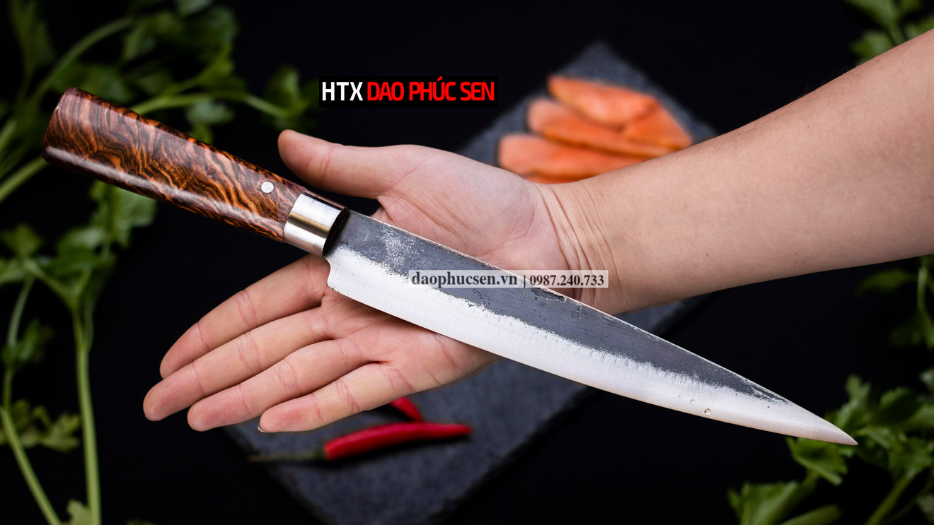- Chức năng: chuyên lọc - thái cá thịt, rau củ. - Kích thước: Lưỡi: 21cm, cán: 12cm, rộng: 5cm, dầy: 2ly, trọng lượng: 200g - Cán : Gỗ mun , Khâu và chốt đồng