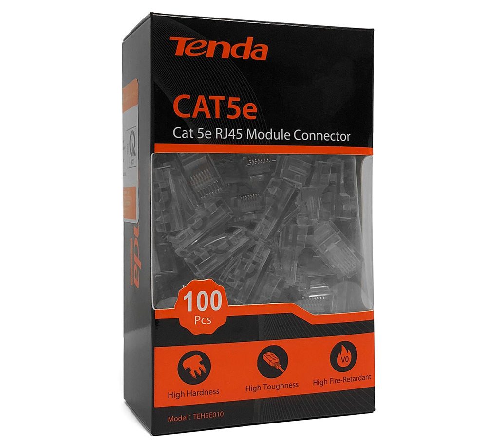 Đầu RJ45 CAT5e Tenda TEH5E010 được sản xuất bởi công ty TENDA ( nhà cung cấp hàng đầu được công nhận về các thiết bị mạng thành lập vào năm 1999) chính hãng luôn đáp ứng được những yêu cầu khắt khe của các doanh nghiệp. Đầu cáp mạng được sản xuất trên dây chuyền lắp ráp công nghệ cao của TENDA có khả năng chống cháy và chống nhiễu mang đến sự yên tâm khi sử dụng và đảm bảo độ bền của đầu mạng. Đầu RJ45 CAT5e Tenda TEH5E010 tương thích với loại dây cáp CAT5e là sản phẩm nâng cấp dựa trên cáp mạng tiêu chuẩn CAT5 ( loại cáp mạng cơ bản nhất, gồm hai loại là UTP không có lớp lá kim loại giảm nhiễu và FTP có lớp lá kim loại giảm nhiễu.) với các tiêu chuẩn tốt hơn về vật liệu, thiết kế và khả năng truyền tải.   Đầu RJ45 CAT5e Tenda TEH5E010 được làm hoàn toàn bằng nhựa nguyên chất, không dùng nhựa tái chế nên đảm bảo độ bền, dẻo dai, không vần đục. Đầu cáp mạng được thiết kế với kích thước 22.4×11.6×8 mm tương thích với các ổ cắm mạng trên các loại máy tính, laptop, thiết bị văn phòng, server,…… Tám đầu tiếp xúc của đầu mạng được làm hợp kim siêu chắc mang đến tốc độ truyền tải nhanh và tốt nếu được bấm dây cẩn thận thích hợp cho các hệ thống cần tốc độ cao và ổn định: Camera, BootRom, Server,…  Sản phẩm còn được đi kèm với hộp đựng gồm 100 đầu mạng giúp người dùng có thể sử dụng tuỳ theo số lượng mong muốn.