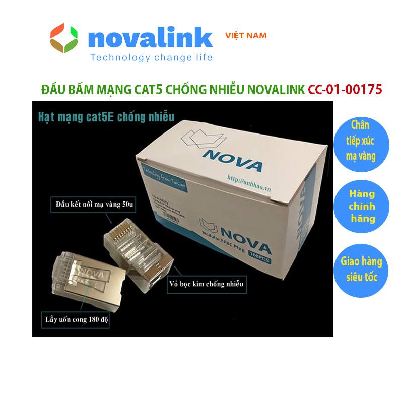 Hạt mạng RJ45 cat5 chống nhiễu Nova CC-01-00175 chân tiếp xúc mạ vàng 50U cao cấp Đầu bấm mạng RJ45 Cat5 chống nhiễu Nova chính hãng là dòng sản phẩm cao cấp do công ty