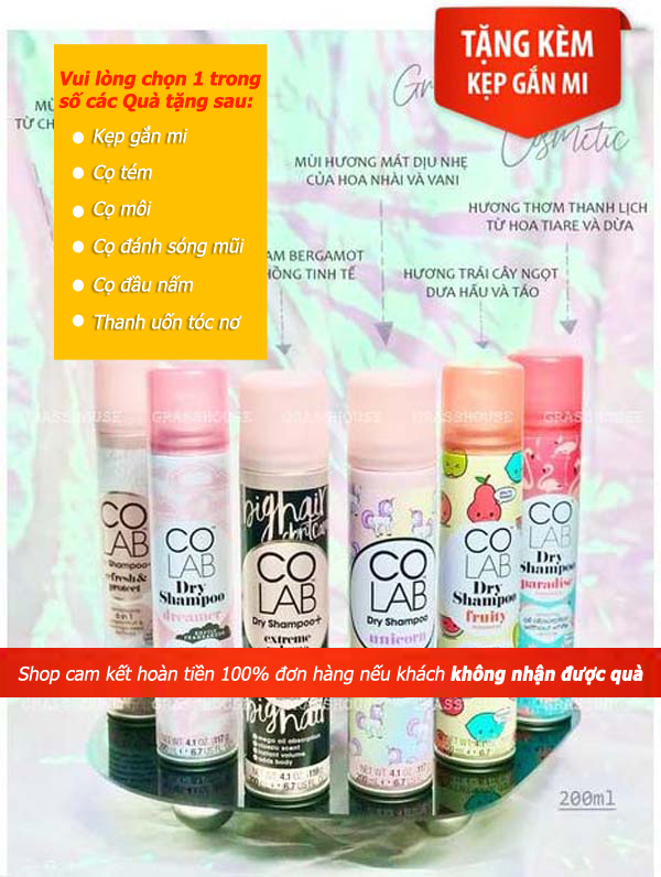 Dầu gội khô COLAB đến từ Anh Quốc giúp giải cứu những mái tóc bết, nhiều dầu với khả năng hút dầu và bụi bẩn nhanh chóng, bồng bềnh, trả lại mái tóc sạch sẽ và tươi mới chỉ sau vài giây sau khi xịt.