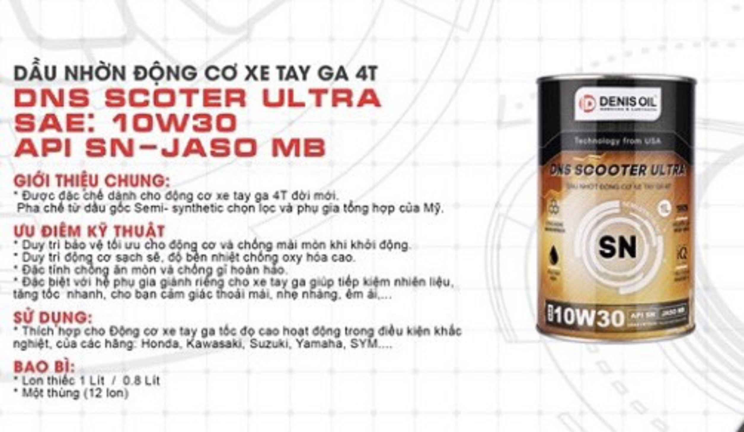 Giới thiệu Được đặc chế dành cho động cơ xe tay ga 4 thì đời mới.Pha chế từ dầu gốc Semi-synthetic chọn lọc và phụ gia tổng hợp của Mỹ. Sản phẩm được áp dụng công nghệ Densyntech tăng sức mạnh động cơ tối ưu, đạt tiêu chuẩn API SN và JASO MB. Ưu điểm Duy trì bảo vệ tối ưu cho động cơ và chống mài mòn khi khởi động. Duy trì động cơ sạch sẽ, độ bền nhiệt và chống oxy hóa cao. Đặc tính chống ăn mòn và chống gỉ hoàn hảo . Đặc biệt với hệ phụ gia giành riêng cho xe tay ga giúp tiết kiệm nhiên liệu, tăng tốc nhanh, cho bạn cảm giác thoải mái, nhẹ nhàng, êm ái,… Ứng dụng Thích hợp cho Động cơ xe tay ga tốc độ cao hoạt động trong điều kiện khắc nghiệt, của các hãng: Honda, Kawasaki, Suzuki, Yamaha, SYM Tiêu chuẩn Đáp ứng API SN - SAE 10W30 ( Hoa kỳ ) và JASO MB - SAE 10W30 ( Nhật bản ). Bảo quản, an toàn sử dụng An toàn sử dụng: Vui long đọc MSDS trước khi sử dụng, giữ cách xa tầm tay trẻ em. Hạn chế để da tiếp xúc cũng như hít vào hơi sương dầu nhớt. Rửa sạch tay bằng xà phòng và nước sạch ngay sau khi sử dụng. Tránh xa nguồn nhiệt, tia lửa và ngọn lửa, kể cả đối với bình rỗng. Tránh đổ nhớt xuống cống rãnh và sông hồ. Các thông tin được giữ kín là bí mật thương mại. Bảo quản và vận chuyển: Vận chuyển bằng phương tiện có mái che và để theo chiều đứng của sản phẩm. Tồn trữ nơi khô ráo thoáng mát. Bao bì lon thiếc 1 lít - 1 thùng 12 lon Denis oil xin cam kết hoàn toàn 100% nếu phát hiện hàng giả . #daunhot#denis#daunhotdenis#hangnhapkhaumy#daunhotmynhapkhau#dau_nhot#daunhotxemay#daunhotxega#daunhototoBảo quản, an toàn sử dụng An toàn sử dụng: Vui long đọc MSDS trước khi sử dụng, giữ cách xa tầm tay trẻ em. Hạn chế để da tiếp xúc cũng như hít vào hơi sương dầu nhớt. Rửa sạch tay bằng xà phòng và nước sạch ngay sau khi sử dụng. Tránh xa nguồn nhiệt, tia lửa và ngọn lửa, kể cả đối với bình rỗng. Tránh đổ nhớt xuống cống rãnh và sông hồ. Các thông tin được giữ kín là bí mật thương mại. Bảo quản và vận chuyển: Vận chuyển bằng phương tiện có mái che và để theo chiều đứng của sản phẩm. Tồn trữ nơi khô ráo thoáng mát.