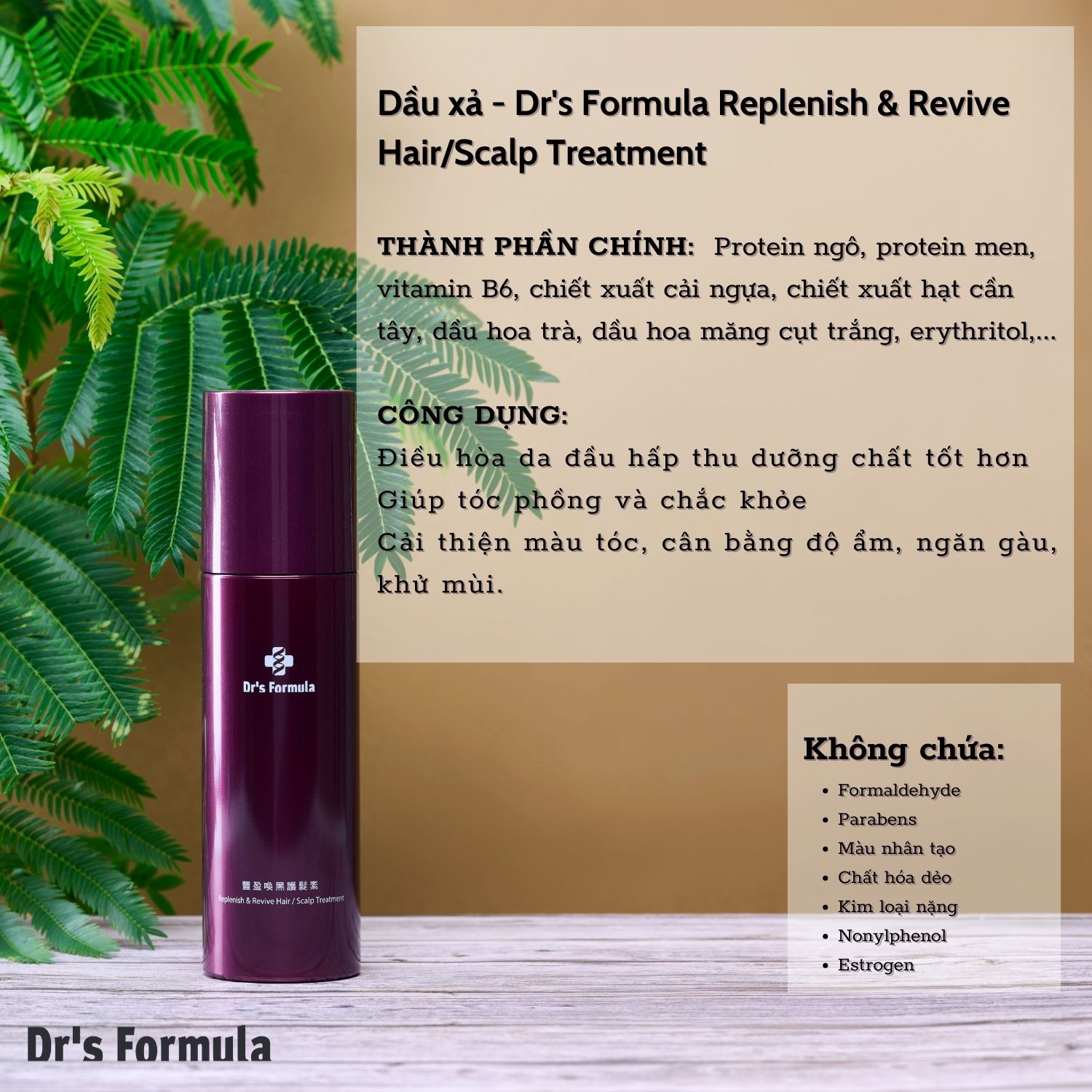 SẢN PHẨM CHÍNH HÃNG 100% NHẬP KHẨU TRỰC TIẾP TỪ ĐÀI LOAN TÊN SẢN PHẨM: Dầu Xả Dưỡng Tóc Đen Mượt & Phục Hồi Tóc/Da Đầu Dr's Formula Replenish & Revive Hair/Scalp Treatment KÍCH CỠ: