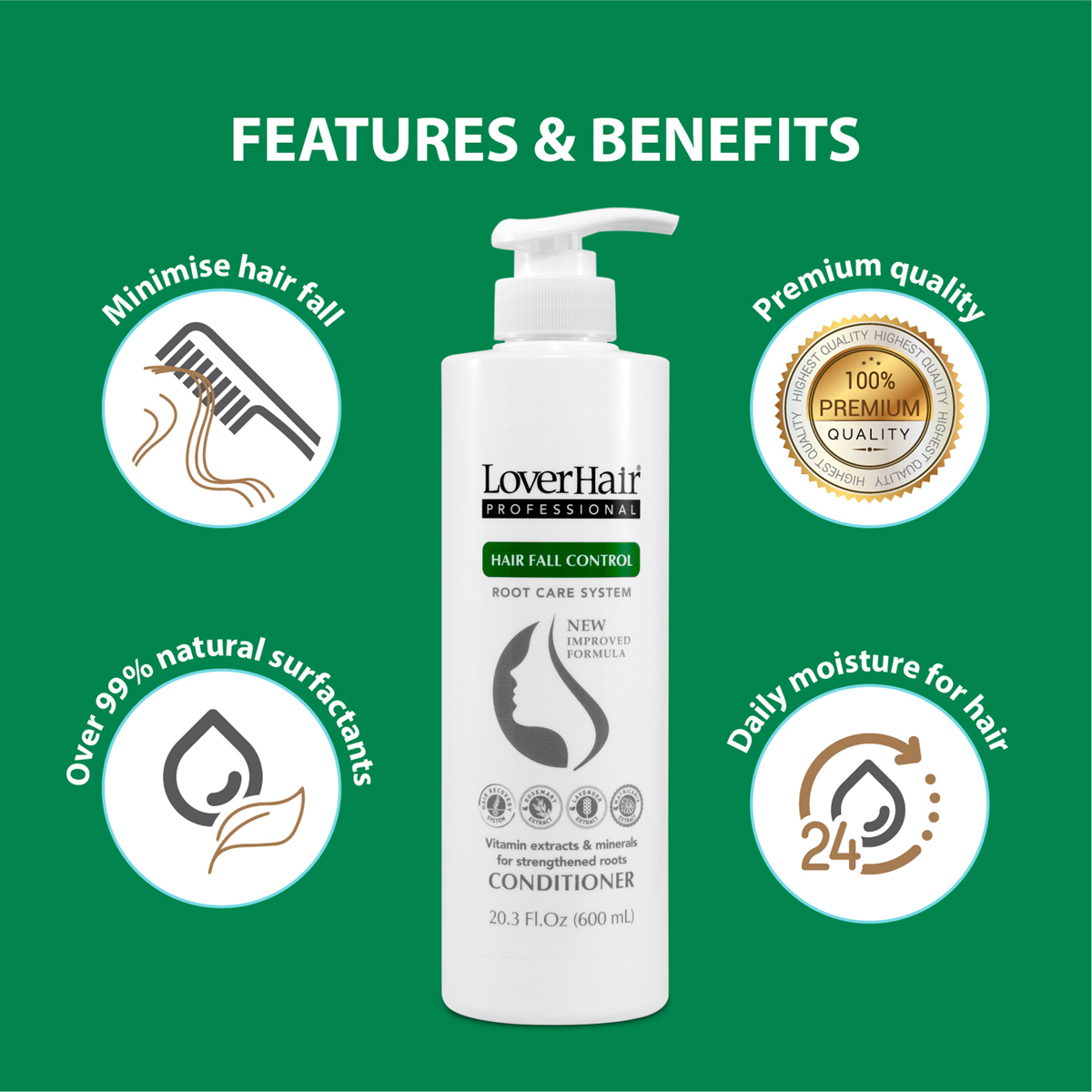 - Dầu Xả Ngăn Ngừa Rụng Tóc Lover's Hair Professional Hair Fall Control (600ml) được đặc chế từ nhiều loại thảo dược thiên nhiên có thành phần giàu Vitamin và khoáng chất giúp cải thiện và chăm sóc da đầu, cho mái tóc dày, chắc khỏe và mang hương thơm quyến rũ suốt cả ngày. Dầu xả có tác dụng giảm ngứa, ngăn gàu và ngăn ngừa rụng tóc, chăm sóc da đầu khỏe mạnh. Sản phẩm thích hợp với mọi loại tóc.