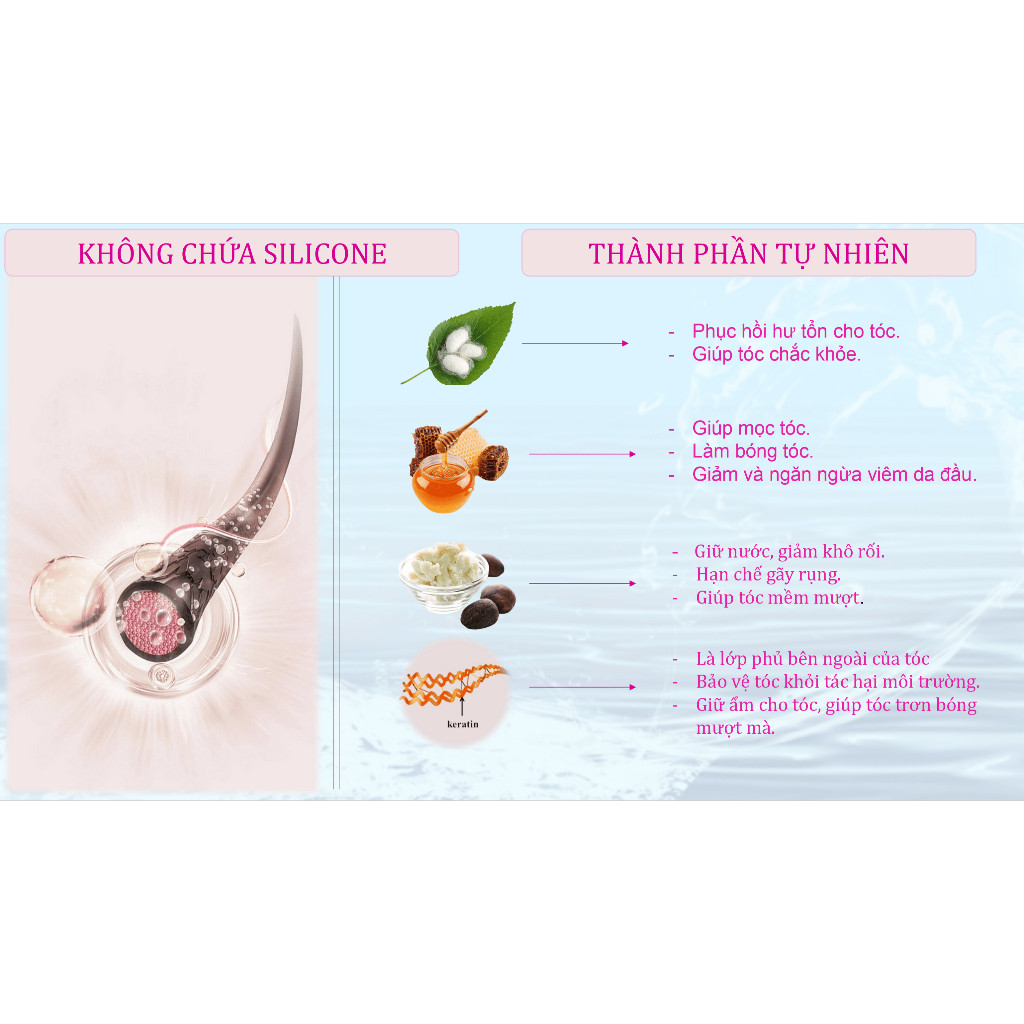 Không làm cho tóc bị bết, dính trong khi vẫn duy trì độ ẩm cần thiết cho mái tóc. Với cơ chế hồi phục sự đàn hồi cũng như độ chắc khỏe cho tóc, đặc