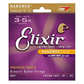 - Bộ Dây Đàn Guitar Acoustic Elixir 16027 được làm bằng dây thép bọc niken, phủ Nanoweb rất mỏng khiến người chơi thấy giống như đang chơi dây thông thường, kích cỡ 11- 52, loại Custom Light,