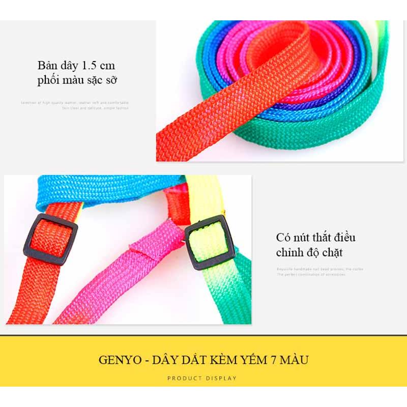 [GIỚI THIỆU] Dây dắt bảy màu dễ thương cho chó mèo 1-3kg Màu: màu phối trộn Size: 1 size dành cho chó mèo nhỏ 1-3kg [MÔ TẢ & CÁCH DÙNG] Có kèm đai yếm đeo vào ngực cho thú cưng Đeo yếm vào cho thú cưng và móc dây vào yếm Tiện trong việc dẫn thú cưng đi dạo hoặc giữ thú. Lưu ý chỉ phù hợp cho thú nhỏ [BẢO QUẢN] Tránh lửa, có thể giặt sau nhiều lần sủ dụng để vệ sinh