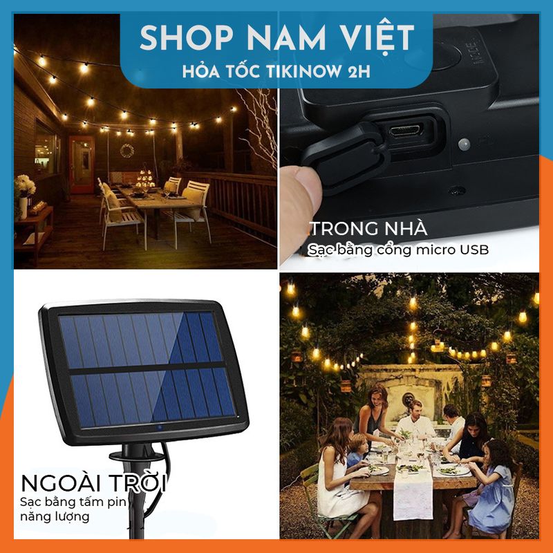 Đóng gói: 1 dây đèn led năng lượng mặt trời ️ Tính năng Dây đèn LED Edison mô phỏng bóng đèn dây tóc cổ điển. Cho ánh sáng êm dịu và sang trọng. Có 8 chế độ chớp khác nhau. Bóng đèn và tấm pin đều được thiết kế để chịu mọi loại thời tiết. Năng lượng nạp từ tấm pin mặt trời, không cần thay pin hoặc cắm điện. Đèn sẽ tự tắt vào ban ngày và sáng vào ban đêm. ️ Thông số Kích thước bóng đèn: 4x8cm Mỗi bóng cách nhau 50cm. Có chuôi để cắm nối tiếp nhiều dây.
