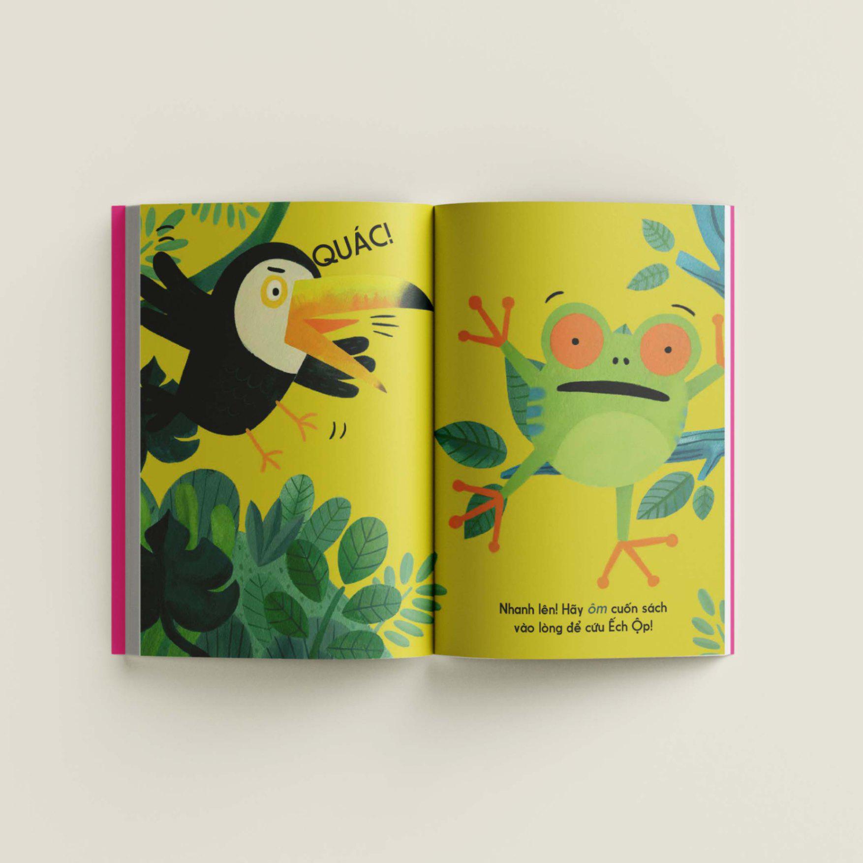 Trong cuốn sách này, em sẽ được gặp bạn Ếch Ộp. Đầu tiên em hãy lắc cuốn sách lên rồi xuống để Ếch Ộp nhảy nhót nhé. Úi cha, em lắc mạnh quá nên Ếch Ộp nhảy mất hút luôn rồi! Hãy để những ngón tay em chạy trên trang sách theo bóng Ếch Ộp nha. Ếch Ộp gặp ai thế kia? Một chú chim toucan không hề thiện chí chút nào. Em hãy lật giở các chiếc lá để giúp Ếch Ộp ẩn m.ình trốn khỏi chú chim gắt gỏng nhé.