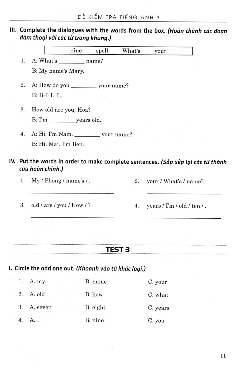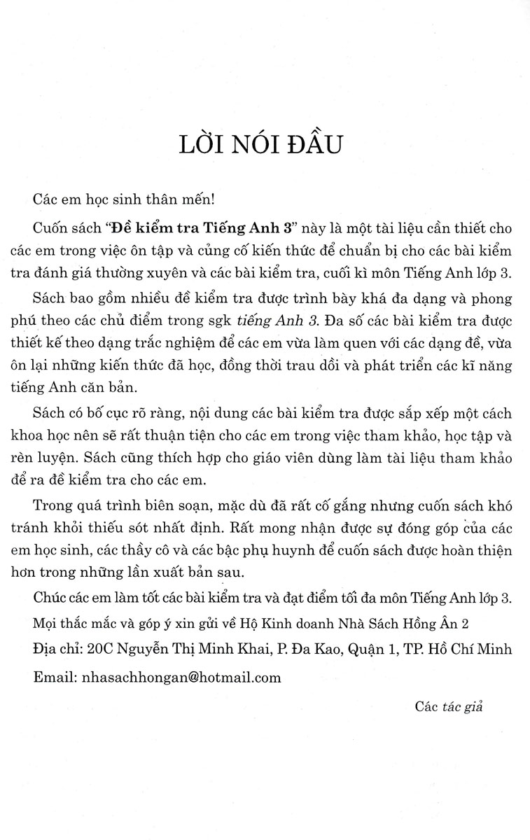 Cuốn sách Đề Kiểm Tra Tiếng Anh 3 - Có Đáp Án (Biên Soạn Theo Chương Trình GDPT Mới) này là một tài liệu cần thiết cho các em trong việc ôn tập và củng cố kiến thức để chuẩn bị cho các bài kiểm tra đánh giá thường xuyên và các bài kiểm tra, cuối kì môn Tiếng Anh lớp 3.
