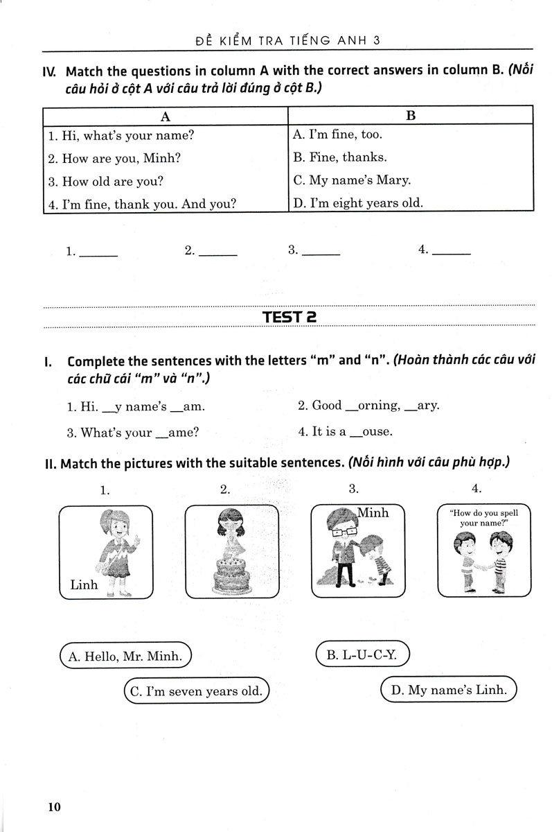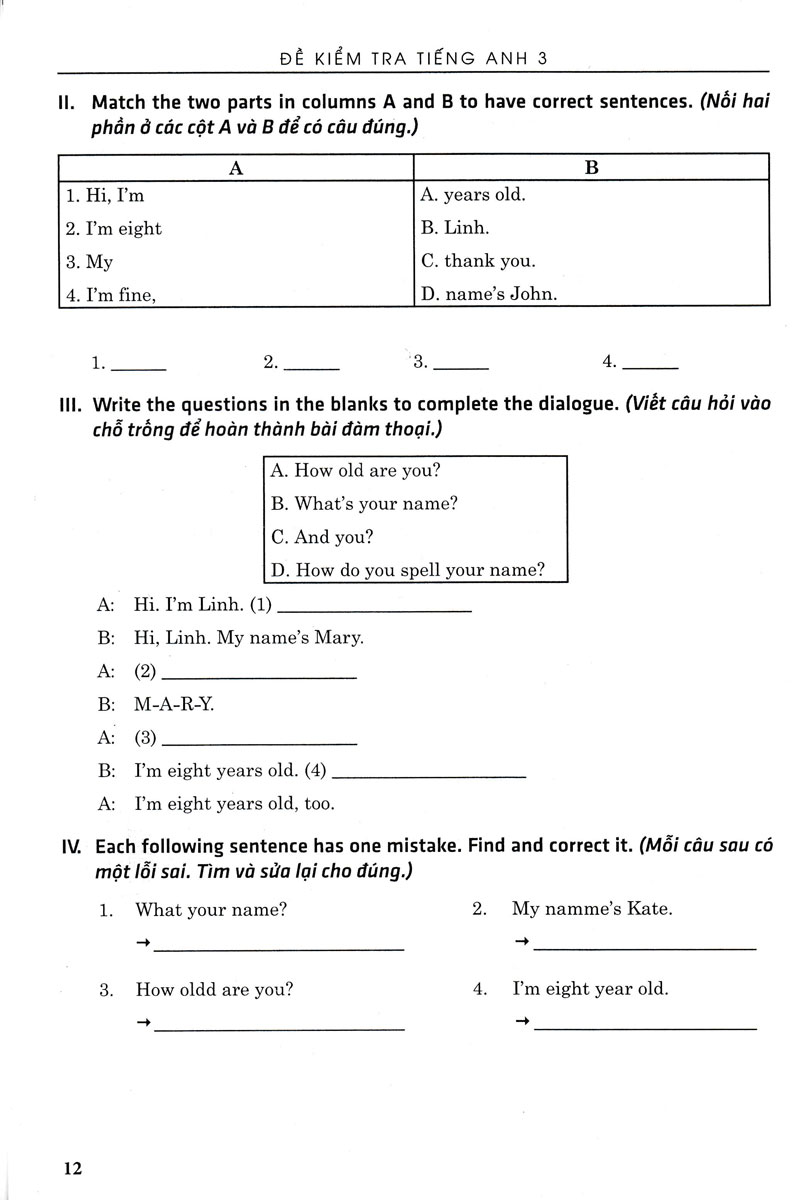 Cuốn sách “Đề kiểm tra Tiếng Anh 4” là một tài liệu cần thiết cho các em trong việc ôn tập và củng cố kiến thức để chuẩn bị cho các bài kiểm tra đánh