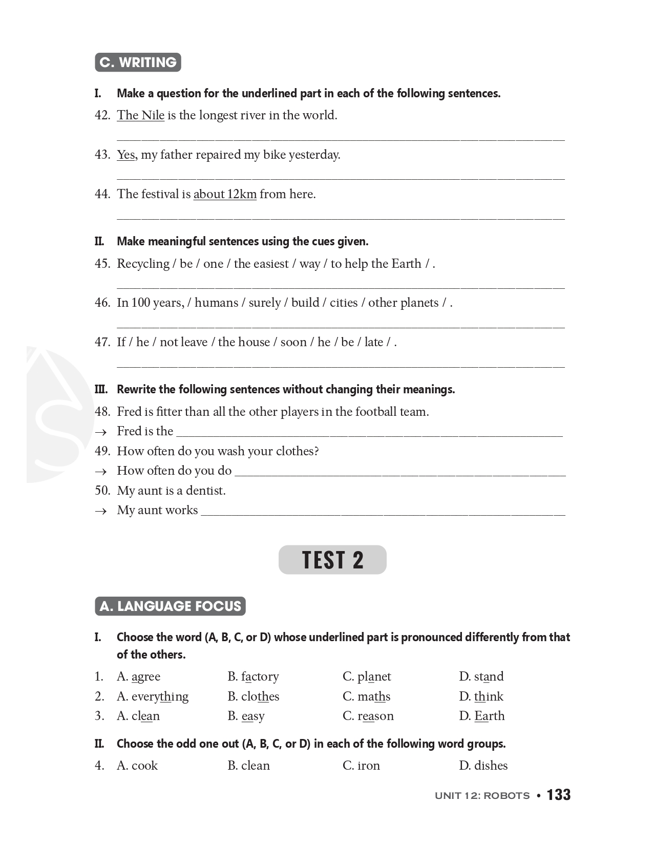 12 đề kiểm tra cuối học kỳ (Term tests): tổng hợp kiến thức 6 đơn vị bài học, giúp học sinh ôn luyện, chuẩn bị cho bài kiểm tra cuối học kỳ.