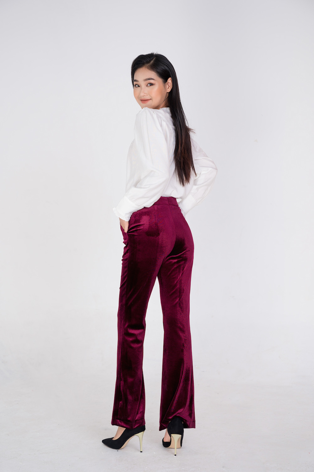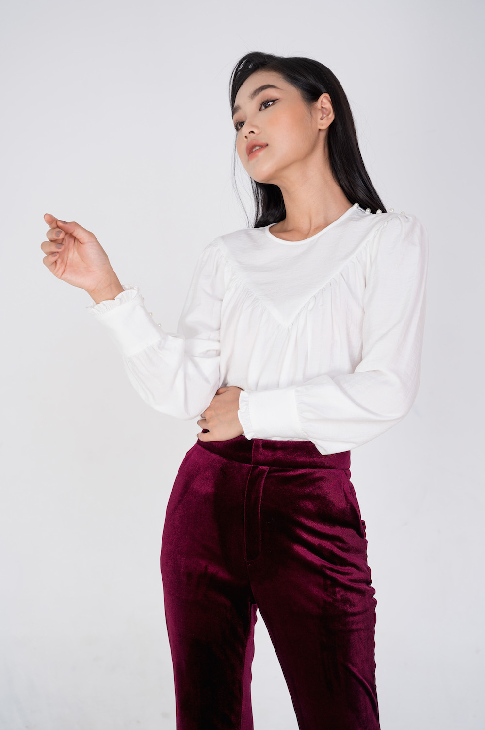 Áo dáng suông, với phần cổ cách điệu được nhún li ngực tạo phom suông rộng trẻ trung. Áo với điểm nhấn là hàng khuy trai 1 bên vài và tay bo kẹp bèo nhí nữ tính.