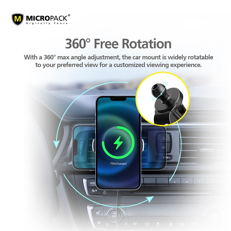 Đế sạc Ôtô MicroPack POWER MOTOR MAGNETIC MCC-15WM Sạc Không Dây 15W   MicroPack là thương hiệu nổi tiếng cung cấp đa dạng các sản phẩm chính bao gồm phụ kiện máy tính, phụ kiện điện thoại và phụ kiện chơi game xuất xứ từ Hong Kong. Với tiêu chí "Color your life - Design your style", Micropack mang đến các sản phẩm không chỉ có chất lượng vượt trội mà còn có thiết kế tinh tế và đa dạng về màu sắc, giúp người dùng thể hiện cá tính riêng của mình.     ĐẶC ĐIỂM NỔI BẬT: • Đầu ra không dây 15W: Hỗ trợ sạc không dây 15W được thiết kế cho iPhone và Android. • Công nghệ QC & PD: Hỗ trợ sạc nhanh QC 3.0 & PD. • Chế độ kép: A. nam châm mạnh B. kẹp clip tự động. • Bảo vệ kép với nam châm mạnh + Chức năng kẹp kẹp tự động: Không chỉ phù hợp cho iPhone12,13 mà còn phù hợp với điện thoại di động hỗ trợ QI không từ tính. • Công dụng kép: A. hút đứng B. kẹp thông hơi chống trượt. Với chân đế thông hơi chống trượt xoay 360 ° có thể giữ thiết bị của bạn thoải mái ngang tầm mắt. • Cảm ứng siêu tụ điện: Kẹp tay vẫn có thể hoạt động trong thời gian ngắn sau khi tắt nguồn hoặc xe tắt máy đột ngột. • Hình dáng & thiết kế trang nhã: Bề mặt kính cường lực và cấu trúc hợp kim nhôm sang trọng vỏ kính như một tấm gương, có thể tránh trầy xước và mài mòn rất nhiều; vật liệu kim loại không dễ trầy xước và ăn mòn.   THÔNG SỐ & CHI TIẾT: • Đầu vào: tối đa 5V/2A, 9V/2.22A • Đầu ra không dây: 5W,7.5W,10W,15W • Tần số làm việc: 110KHz ~ 205KHz • Khoảng cách truyền: ≤8mm • Hiệu suất chuyển đổi năng lượng: >79% • Màu sắc: Xám + Đen • Chất liệu: Kính + Hợp kim nhôm + ABS + Silicon   BẢO HÀNH CHÍNH HÃNG: bảo hành 1 năm   Hộp bao gồm: