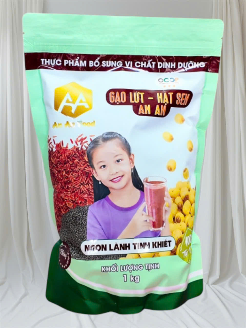 Tên sản phẩm: Ngũ cốc dây thìa canh 500g * Thành phần: hạt mầm đậu xanh, yến mạch, hạt mầm đậu đen xanh lòng, hạt điều, hạt gạo lứt đỏ, hạt sen, ngô nếp, hạt