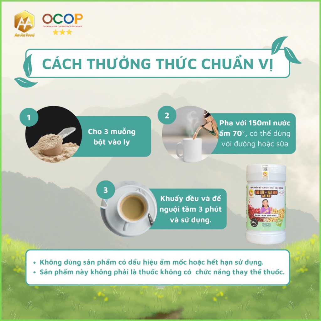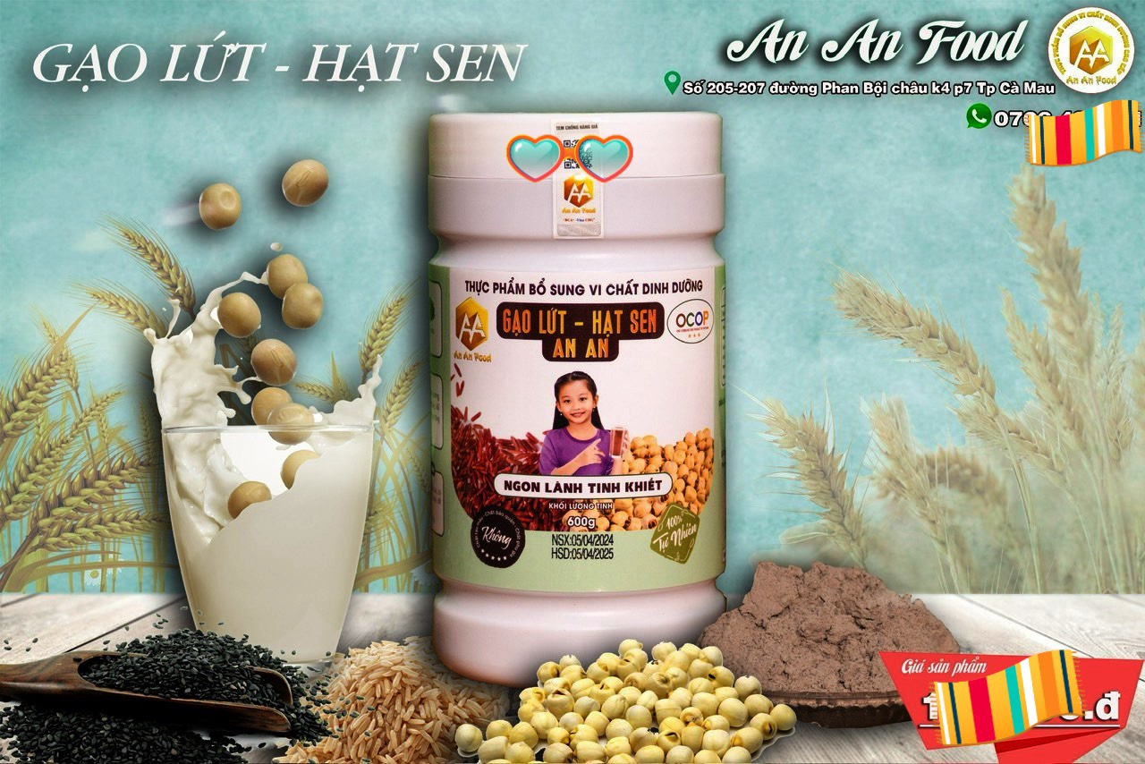 Sản phẩm: Bột gạo lứt hạt sen mè đen đạt OCOP 3 saoCông dụngCung cấp năng lượng: Bột gạo lứt hạt sen mè đen là nguồn cung cấp năng lượng dồi dào, giúp bạn cảm thấy no lâu và duy trì năng lượng suốt cả ngày.Hỗ trợ tiêu hóa: Chứa nhiều chất xơ giúp cải thiện chức năng tiêu hóa và ngăn ngừa táo bón.Tăng cường sức khỏe tim mạch: Mè đen chứa nhiều axit béo không bão hòa và chất chống oxy hóa, giúp bảo vệ sức khỏe tim mạch.Giảm căng thẳng, lo âu: Hạt sen có tác dụng an thần, giúp giảm căng thẳng, lo âu và cải thiện chất lượng giấc ngủ.Thành phầnGạo lứt: 100% gạo lứt nguyên chất, giàu chất xơ và dinh dưỡng.Hạt sen: Hạt sen tươi, giàu protein và các dưỡng chất thiết yếu.Mè đen: Mè đen nguyên chất, chứa nhiều chất chống oxy hóa và vitamin.Giấy tờ kiểm địnhChứng nhận OCOP 3 sao: Sản phẩm được chứng nhận OCOP 3 sao bởi Ủy ban nhân dân tỉnh Cà Mau.Giấy kiểm định chất lượng: Sản phẩm đã qua kiểm định chất lượng bởi cơ quan chức năng, đảm bảo an toàn vệ sinh thực phẩm.Cách sử dụngPha uống: Cho 2-3 muỗng bột vào 200ml nước ấm, khuấy đều và uống. Có thể thêm đường hoặc sữa tùy khẩu vị.Hashtags#BộtGạoLứtHạtSenMèĐen #OCOP3Sao #ĐặcSảnCàMau #BộtDinhDưỡng #AnToànVệSinh #SảnPhẩmCaoCấp #ThựcPhẩmSạch #SứcKhỏeGiaĐình #GiảmCăngThẳng #HỗTrợTiêuHóa