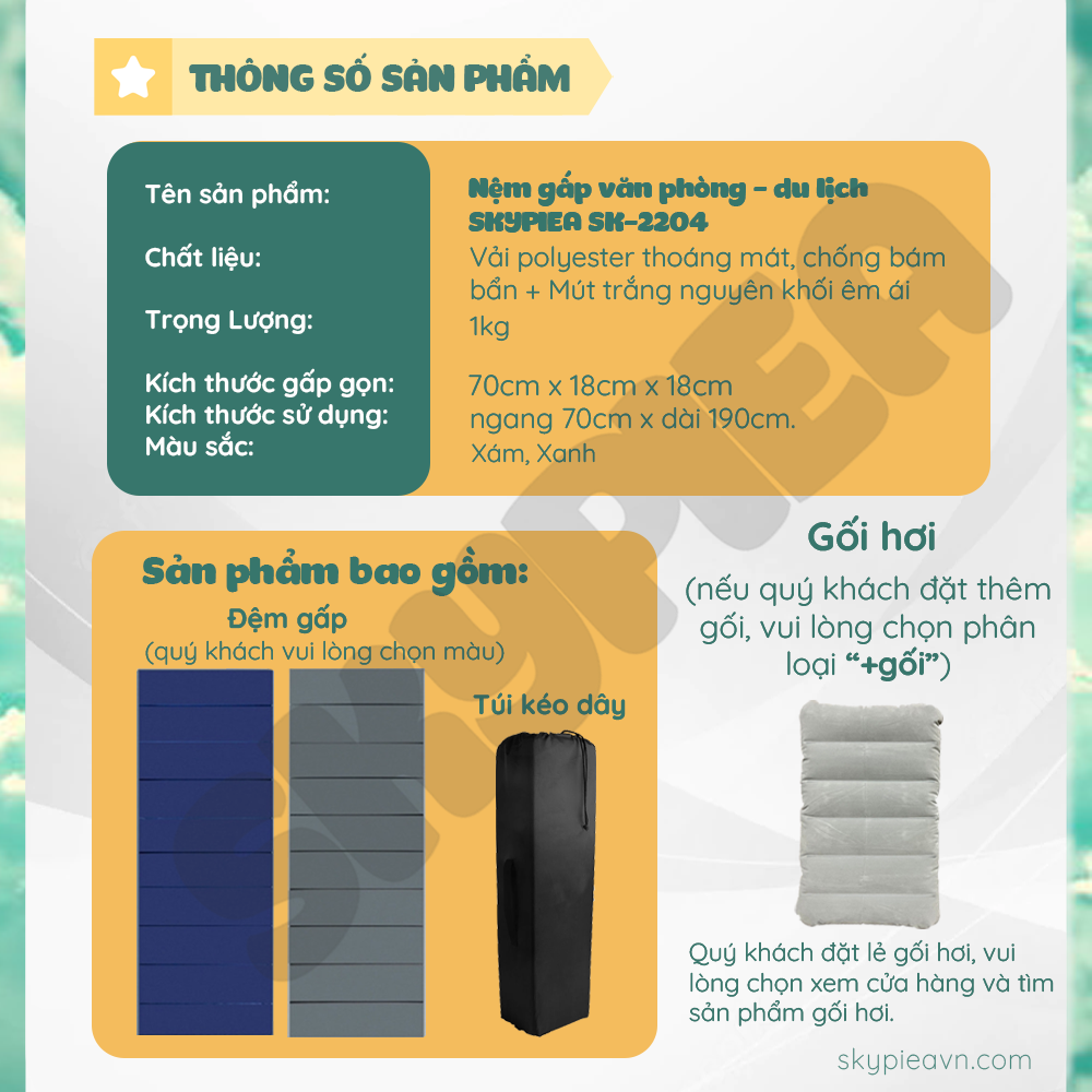 Nệm được thiết kế một cách nhỏ gọn và có qoai xách phù hợp với việc sử dụng cũng như cất giữ tại văn phòng làm việc.