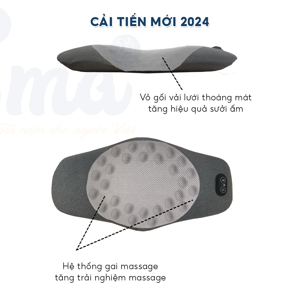 • Chất liệu: Ruột cao su non gắn trong là động cơ massage rung kép + tấm chườm nóng, vỏ gối gấm chần phối với cotton đũi trơn