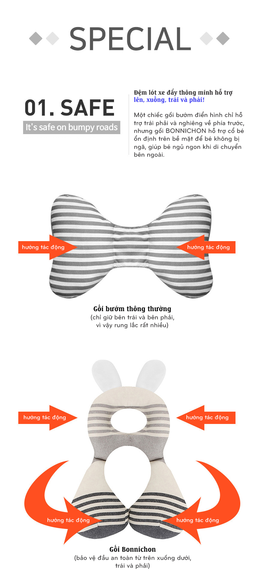 - Đệm xe đẩy thông minh hỗ trợ lên, xuống, trái và phải giúp giữ an toàn trên đường gập ghềnh cho bé