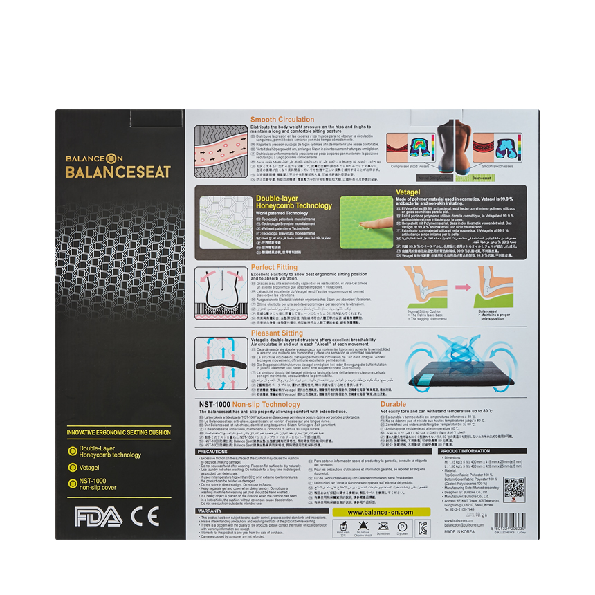 - Đệm Ngồi Cao Cấp Bullsone được làm từ chất liệu có khả năng đàn hồi và êm ái. Sản phẩm đã có bằng sáng chế của Hàn Quốc và đã đăng ký RDA của Hoa Kỳ. Hơn nữa, sản phẩm còn đạt chứng nhận CE dành cho thiết bị y tế, đoạt giải thiết kế Reddot năm 2016.