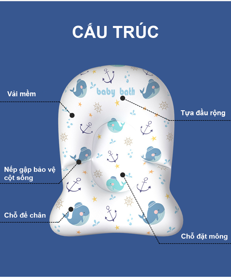 - Chất liệu mềm mại, an toàn - Nâng đỡ hiệu quả cơ thể và thiết kế phù hợp với lưng của bé - Móc hình chữ U giúp cố định vào thau tắm bé