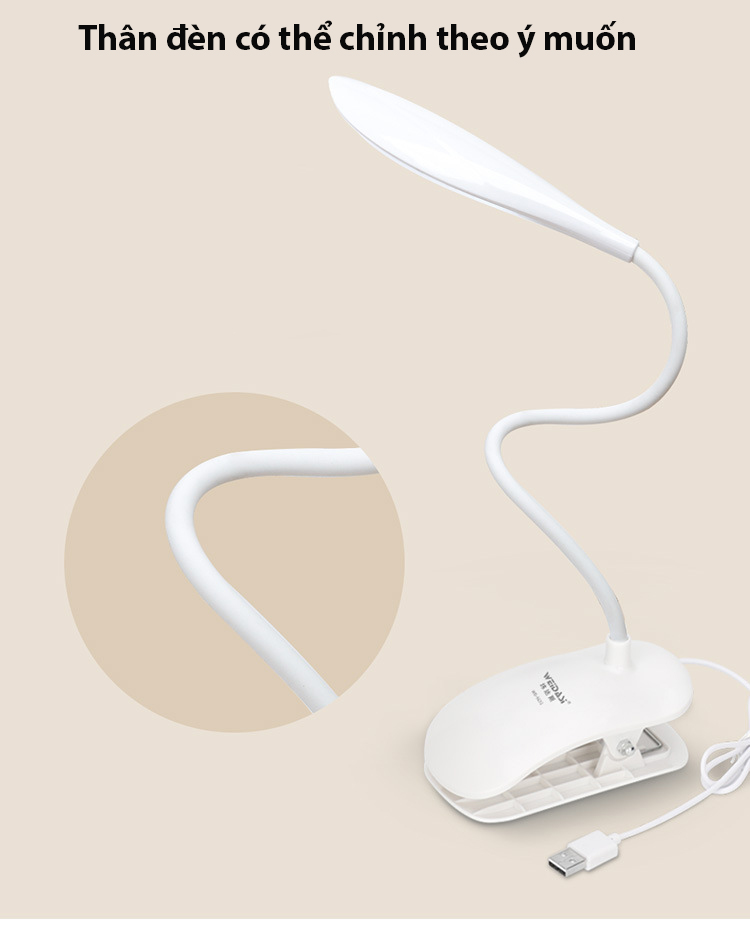 Mô Tả Sản Phẩm Khách hàng lưu ý : Đèn tích điện mới có chỗ cắm sạc và 3 chế độ, còn đèn cắm dây, dây sẽ liền đèn.. Đèn Led kẹp bàn chống cận